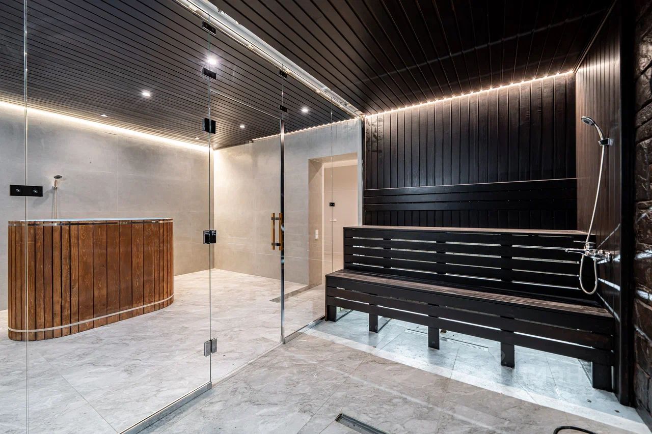 Планировка дома: 1 этаж — просторная гостиная с выходом на участок, большая кухня, спальня, санузел и гардеробная. 2 этаж — мастер-спальня, две отдельные спальни, санузел и выход на балкон. Мансарда — кабинет с зоной отдыха, две спальни, санузел и гардеробная. Цокольный этаж — кинотеатр, спортзал, сауна с душевой и санузлом, кухня с обеденной зоной, гардеробная и постирочная.
