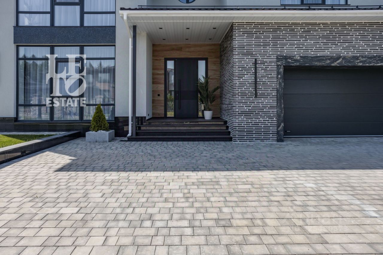 Участок с парковкой на чнтыре автомобильных места, оснащён автоматическими воротами и калиткой с видеодомофоном, мощение BRAER, ландшафтный дизайн: хвойные посадки, газон, ночное освещение, организован дренаж для отвода воды с кровли и бассейна.