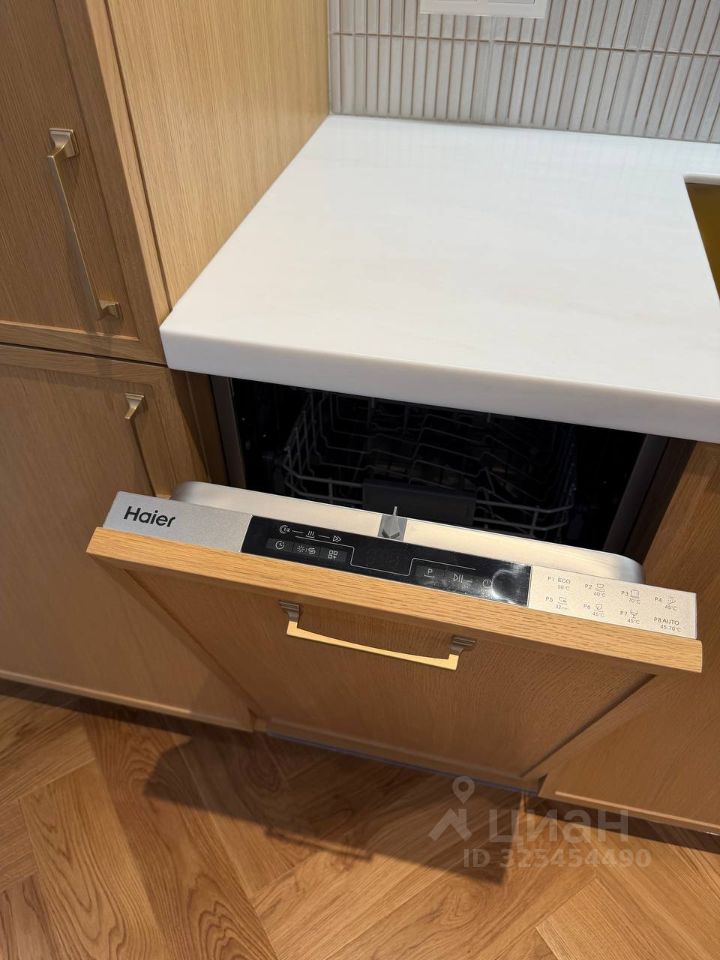 Современное планировочное решение. Кухня-гостиная 23 кв.м. и изолированная спальня. Новая современная мебель и техника. Стильный кухонный гарнитур со встроенной бытовой техникой (духовой шкаф, индукционная варочная панель, посудомоечная машина фирмы Haier). Вместительный холодильник. Установлены стиральная и сушильные машины.
