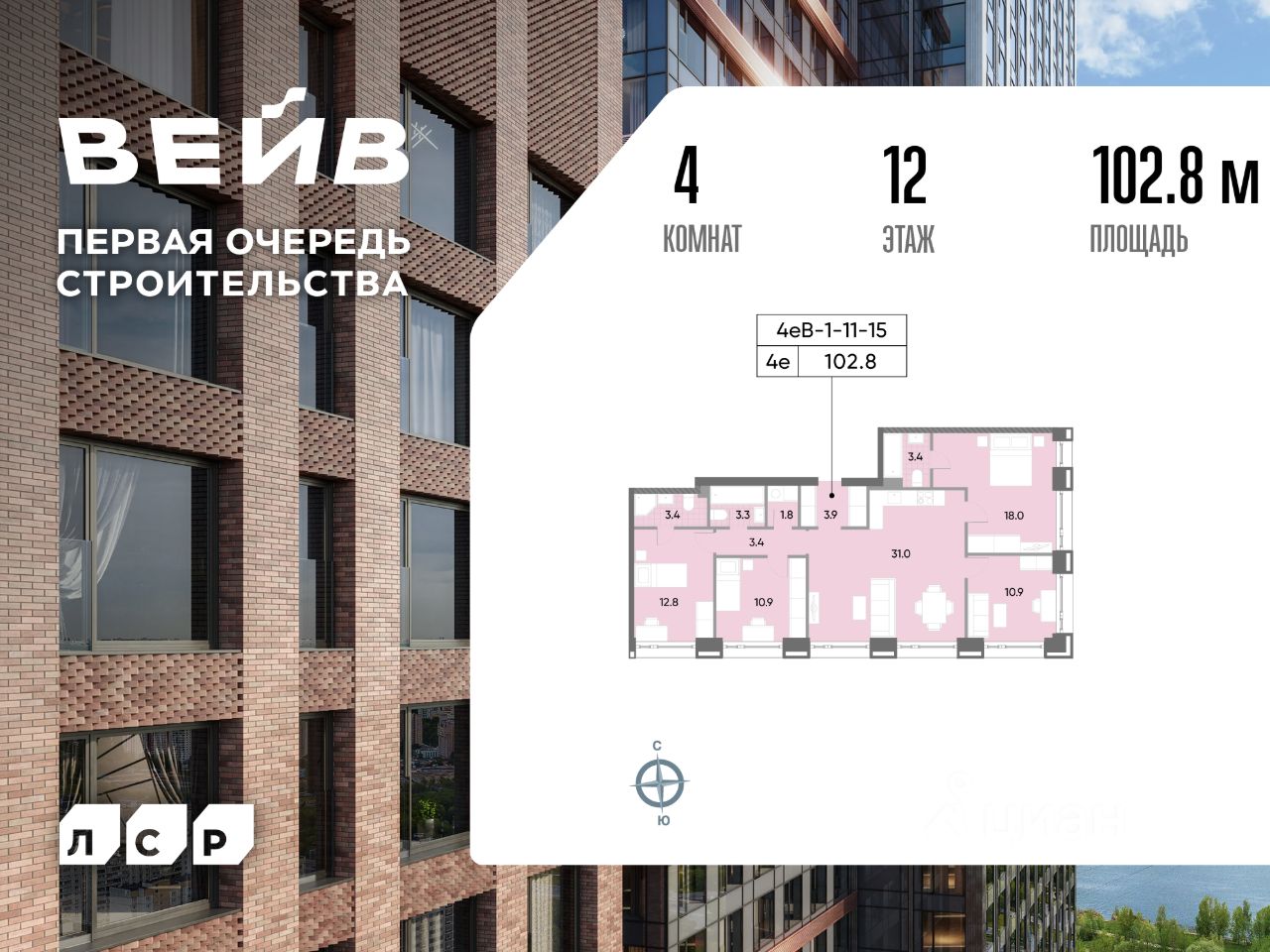 Продается 4-комн. кв-ра площадью 102.80 кв.м на 12 этаже 29 этажного монолитного дома в ЖК ''ВЕЙВ'' от Группа ЛСР. Ключевым преимуществом ВЕЙВ является благоустроенная набережная со смотровой площадкой, беговыми и велодорожками, детскими и спортивными. В центре квартала появится зеленый пешеходный бульвар с детскими и спортивными площадками, а также зоной тихого отдыха. Вокруг жилого квартала сосредоточены более 2000 га зеленых пространств: парк ''Борисовские пруды'', Братеевский каскадный парк, парк 850-летия г. Москвы, музеи-заповедники ''Царицыно'' и ''Коломенское''. Особое внимание в ВЕЙВ уделено интерьерам лобби, выполненным в современном стиле с яркими акцентами.