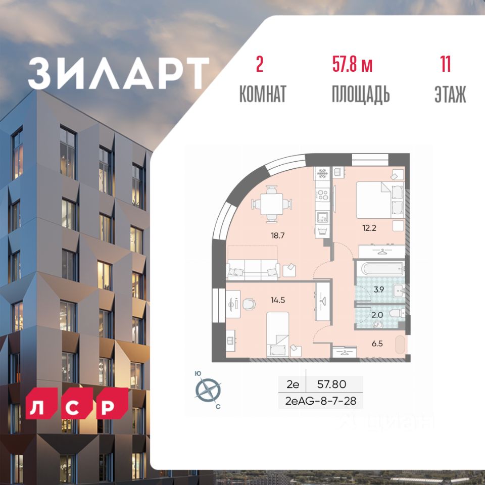 Продается 2-комн. кв-ра площадью 57.80 кв.м на 11 этаже 28 этажного монолитно-кирпичного дома в ЖК ''ЗИЛАРТ'' от Группа ЛСР. ЗИЛАРТ ГРАНД — новый дом в сердце квартала ''ЗИЛАРТ''. Архитектурный проект разработан бюро ''Цимайло Ляшенко и Партнеры''. Дом представляет собой семь башен, объединенных единым стилобатом. ЗИЛАРТ ГРАНД уникален своей необыкновенной архитектурой благодаря чередованию фасадов, текстур и материалов.