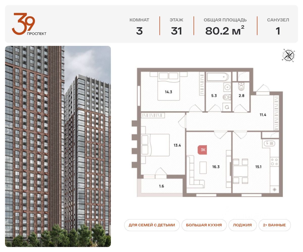 Продается трехкомнатная квартира в ЖК ''Проспект 39'' по адресу Москва, ЮВАО, Рязанский проспект, вл. 39, к. 2. Общая площадь квартиры - 80,20 кв.м., этаж 31. Стоимость квартиры - 30 864 950 р. Продаётся без отделки.