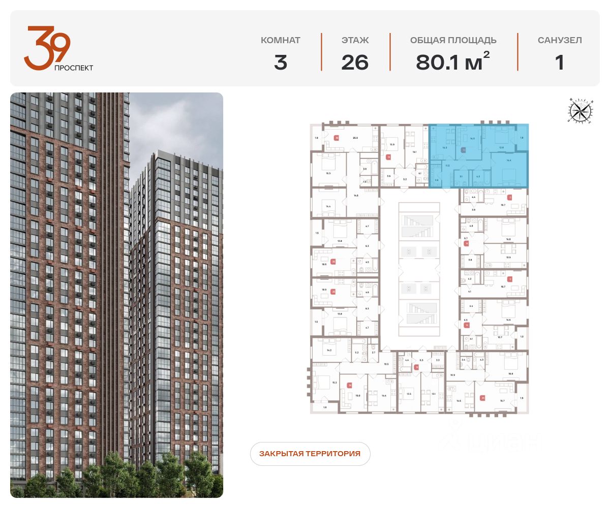 Продается трехкомнатная квартира в ЖК ''Проспект 39'' по адресу Москва, ЮВАО, Рязанский проспект, вл. 39, к. 1. Общая площадь квартиры - 80,10 кв.м., этаж 20. Стоимость квартиры - 28 540 714 р. Продаётся без отделки.