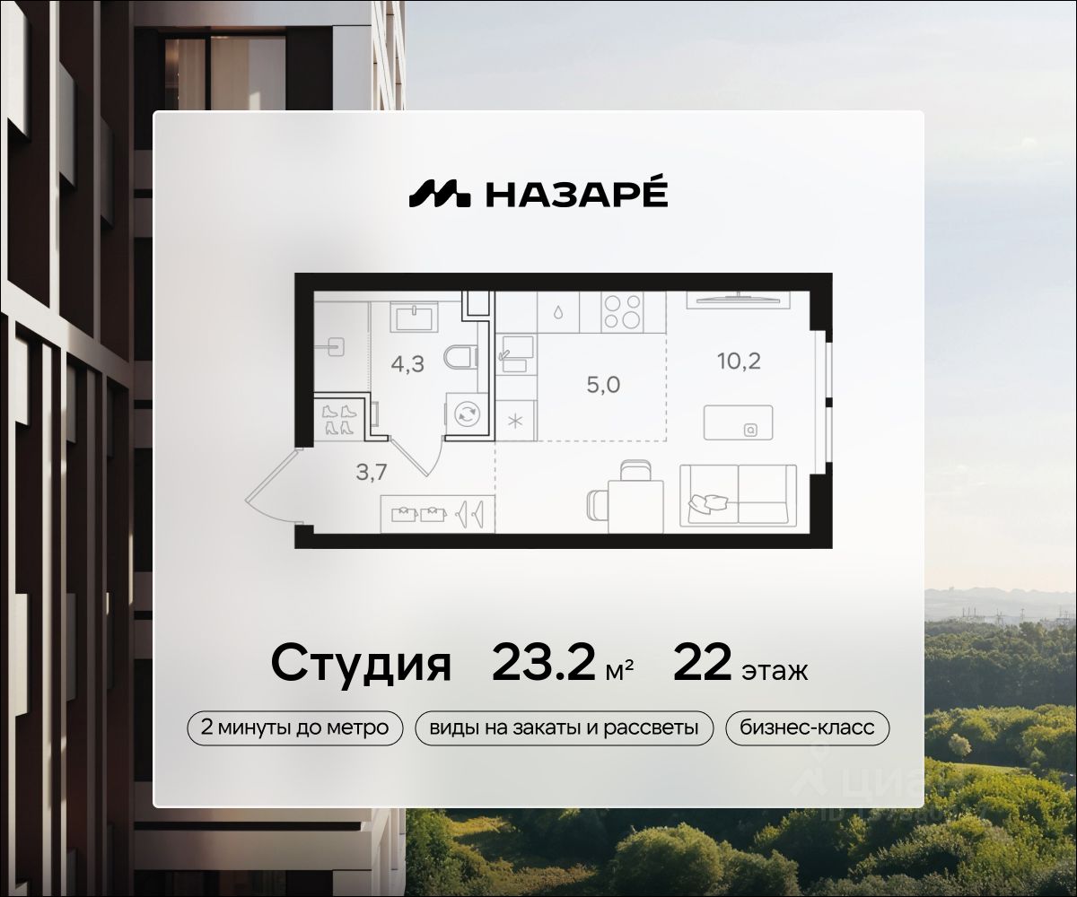 Продается студия в ЖК ''НАЗАРЕ''' Общая площадь - 23.20 Тип дома - монолитный Этаж - 22 Год сдачи - 2028 Предлагается квартира площадью 23.20 кв. м в новом современном квартале на востоке Москвы, прямо у станций метро и МЦК ''Бульвар Рокоссовского''. Квартира располагается в корпусе 3 на 22 этаже комплекса бизнес-класса ''НАЗАРЕ'''.