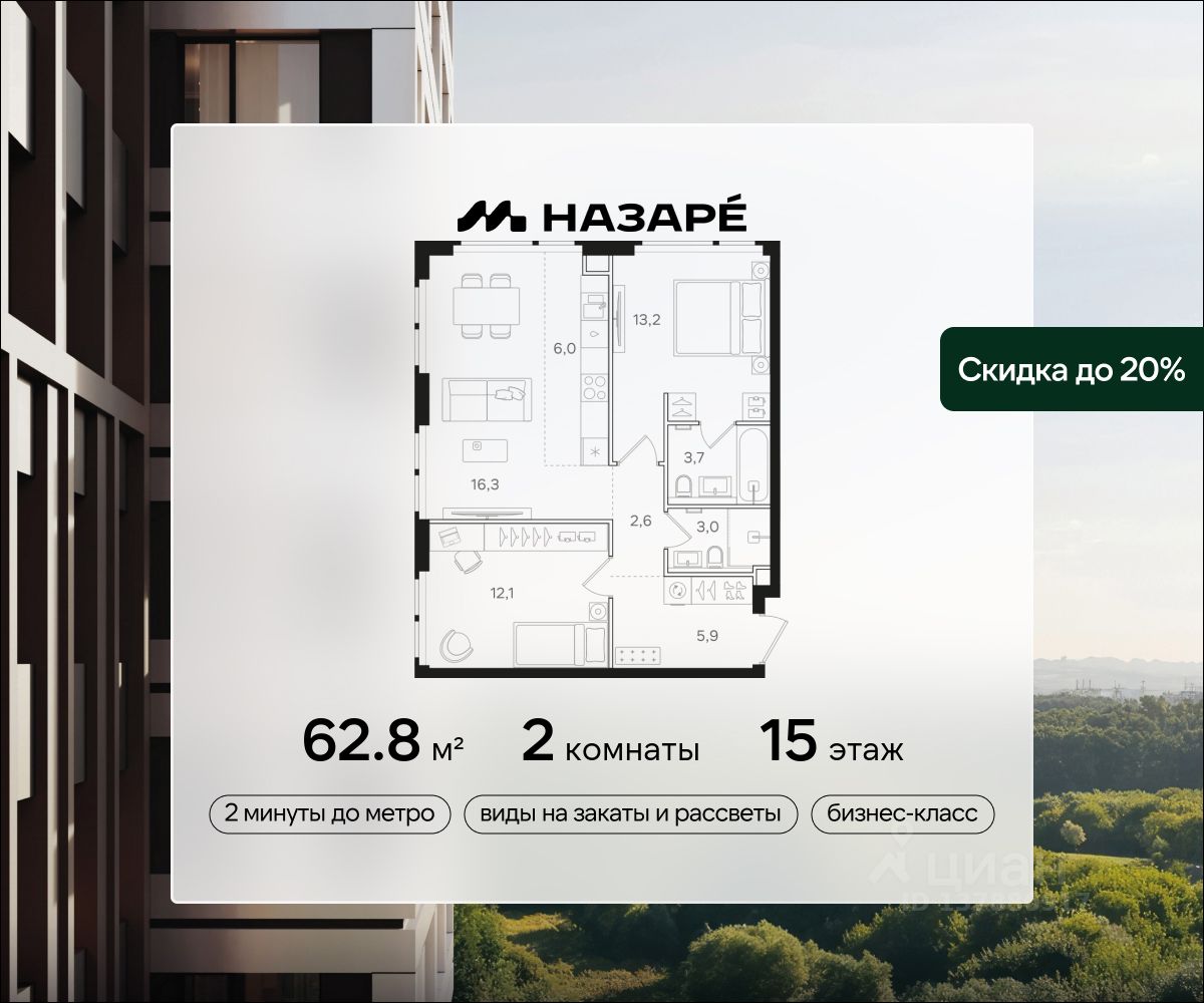 Просторная 2-комнатная квартира для молодой семьи. Общая площадь - 62.8м2, удобная планировка, кухня-гостиная 22.3м2. Панорамные виды из окон на две стороны - на национальный парк ''Лосиный остров'' и благоустроенный внутренний двор. Условия покупки: - Скидка при полной оплате - 10% - Ипотека от 3,5% на весь срок или 0,11% на первый год - Рассрочка без процентов - Trade-in с проживанием на время строительства дома НАЗАРЕ - шесть домов бизнес-класса высотой 24-43 этажа. Проект расположен рядом с национальным парком ''Лосиный остров'' и парком ''Сокольники''. В продаже квартиры с мастер-спальнями, кухнями-гостиными, открытыми террасами, просторными кладовыми и ванными с окном. Форматы - от светлых студий 21,6 м2 до семейных 4-комнатных 125,5 м2.
