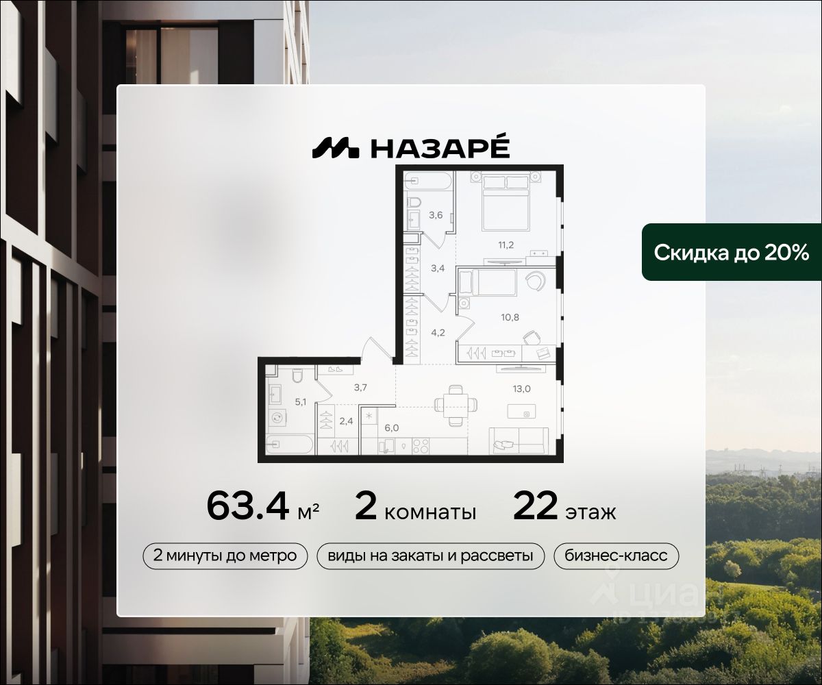 Просторная 2-комнатная квартира для молодой семьи. Общая площадь - 63.4м2, удобная планировка, кухня-гостиная 19м2. Панорамные виды из окон на две стороны - на национальный парк ''Лосиный остров'' и благоустроенный внутренний двор. Условия покупки: - Скидка при полной оплате - 10% - Ипотека от 3,5% на весь срок или 0,11% на первый год - Рассрочка без процентов - Trade-in с проживанием на время строительства дома НАЗАРЕ - шесть домов бизнес-класса высотой 24-43 этажа. Проект расположен рядом с национальным парком ''Лосиный остров'' и парком ''Сокольники''. В продаже квартиры с мастер-спальнями, кухнями-гостиными, открытыми террасами, просторными кладовыми и ванными с окном. Форматы - от светлых студий 21,6 м2 до семейных 4-комнатных 125,5 м2.