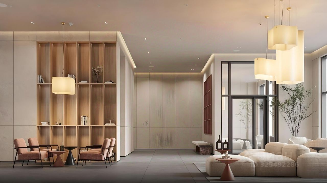 • дизайнерские лобби от бюро ABOVE ARCHITECTURE с панорамными окнами, интерьерами в теплой цветовой гамме и мягкой зоной ожидания располагаются в каждой башне,