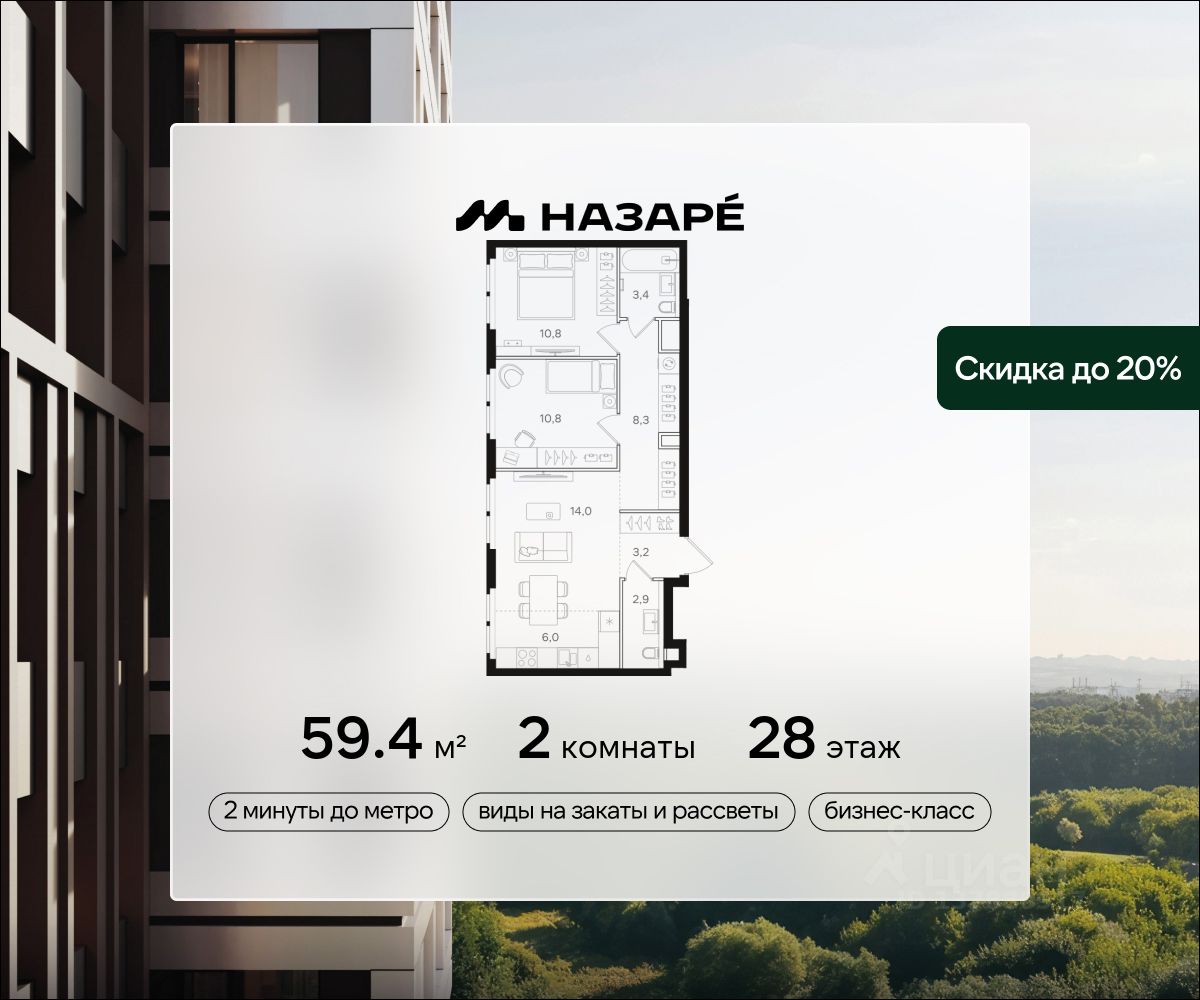 Просторная 2-комнатная квартира для молодой семьи. Общая площадь - 59.4м2, удобная планировка, кухня-гостиная 20м2. Панорамные виды из окон на две стороны - на национальный парк ''Лосиный остров'' и благоустроенный внутренний двор. Условия покупки: - Скидка при полной оплате - 10% - Ипотека от 3,5% на весь срок или 0,11% на первый год - Рассрочка без процентов - Trade-in с проживанием на время строительства дома НАЗАРЕ - шесть домов бизнес-класса высотой 24-43 этажа. Проект расположен рядом с национальным парком ''Лосиный остров'' и парком ''Сокольники''. В продаже квартиры с мастер-спальнями, кухнями-гостиными, открытыми террасами, просторными кладовыми и ванными с окном. Форматы - от светлых студий 21,6 м2 до семейных 4-комнатных 125,5 м2. Часть лотов - с предчистовой отделкой White Box. Транспортная доступность: - Метро ''Бульвар Рокоссовского'' и МЦК - 2 мин. пешком - Северо-Восточная хорда - 3 мин. на автомобиле - Третье транспортное кольцо - 15 мин. на автомобиле - Садовое кольцо - 18 мин. на автомобиле Инфраструктура: В составе проекта появится собственный детский сад и торгово-развлекательный центр с акцентом на шопинг и досуг. На первых этажах домов откроются кафе, пекарни, магазины и службы сервиса. В районе Богородское находятся престижные школы, медцентры, магазины и спортивные клубы.