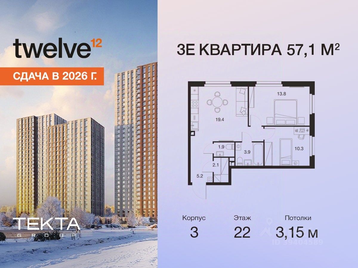 3-комн. квартира в ЖК ''Twelve'' на 22 этаже в 28 этажном здании Корпус 3. Общая площадь: 57.1 кв.м., жилая: 36.90 кв.м. Высота потолков 3.15 м.
