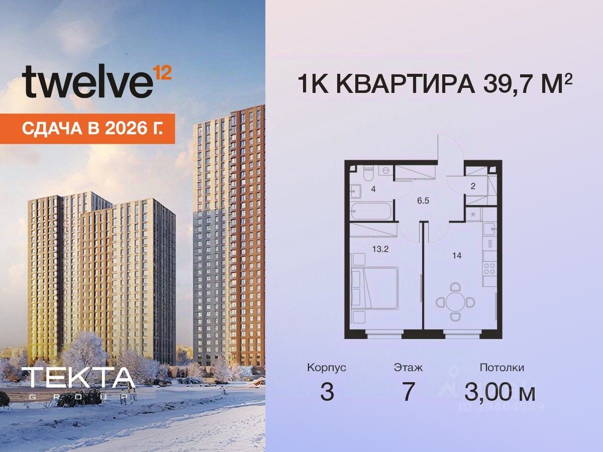 1-комн. квартира в ЖК ''Twelve'' на 7 этаже в 28 этажном здании Корпус 3. Общая площадь: 39.7 кв.м., жилая: 13.20 кв.м. Высота потолков 3.00 м.