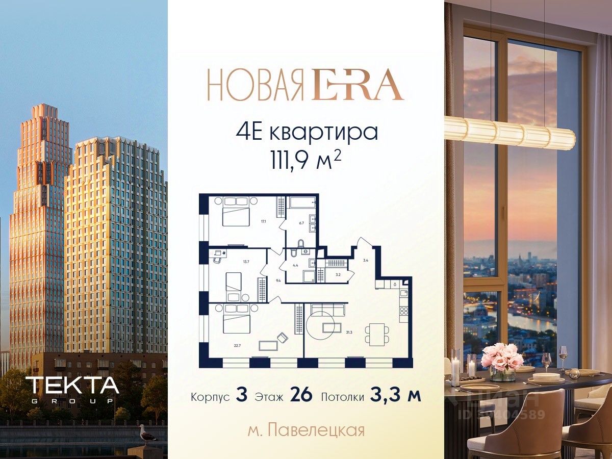 4-комн. квартира в ЖК ''Era'' на 26 этаже в 33 этажном здании Корпус 3. Общая площадь: 111.9 кв.м., жилая: 64.20 кв.м. Высота потолков 3.30 м.