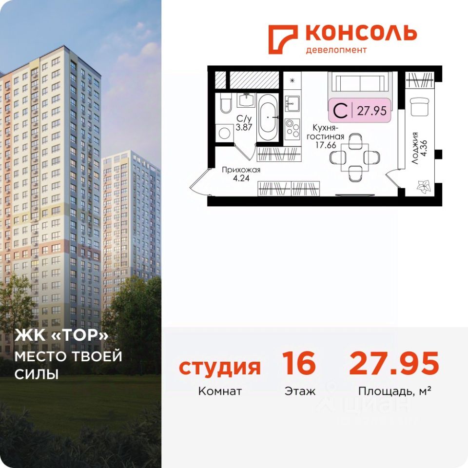 Продается квартира-студия 143 без отделки в ЖК ''ТОР'' площадью 27.95 на 16 этаже от застройщика Консоль девелопмент.