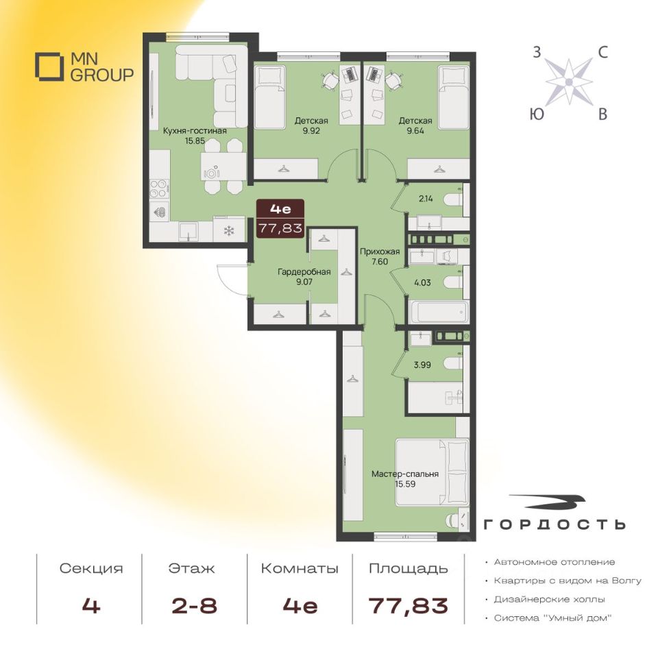 Преимущества: Панорамные виды на Волгу Автономное отопление Двор без машин Усиленная шумоизоляция пола Горизонтальная разводка Разнообразие планировочных решений Закрытая территория с видеонаблюдением 24/7 Система Умный дом