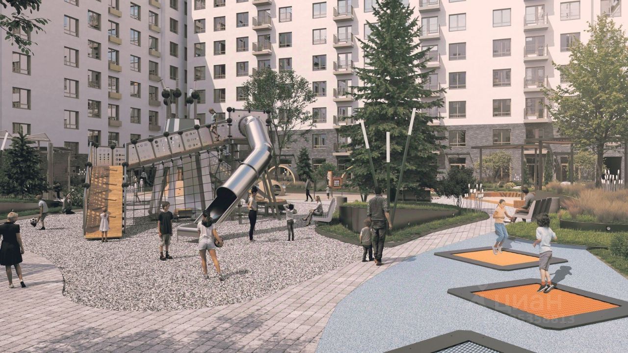 На внутренней территории жилого комплекса предусмотрен закрытый двор c зонами для работы и отдыха, спортивными и детскими площадкми. Продуманный ландшафтный дизайн с разнообразными растениями создаст дополнительный уют на территории двора. Благодаря сквозным подъездам легко попасть на улицу и двор.