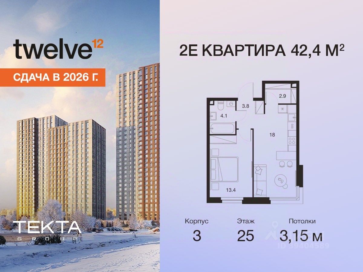2-комн. квартира в ЖК ''Twelve'' на 25 этаже в 28 этажном здании Корпус 3. Общая площадь: 42.4 кв.м., жилая: 24.60 кв.м. Высота потолков 3.15 м.