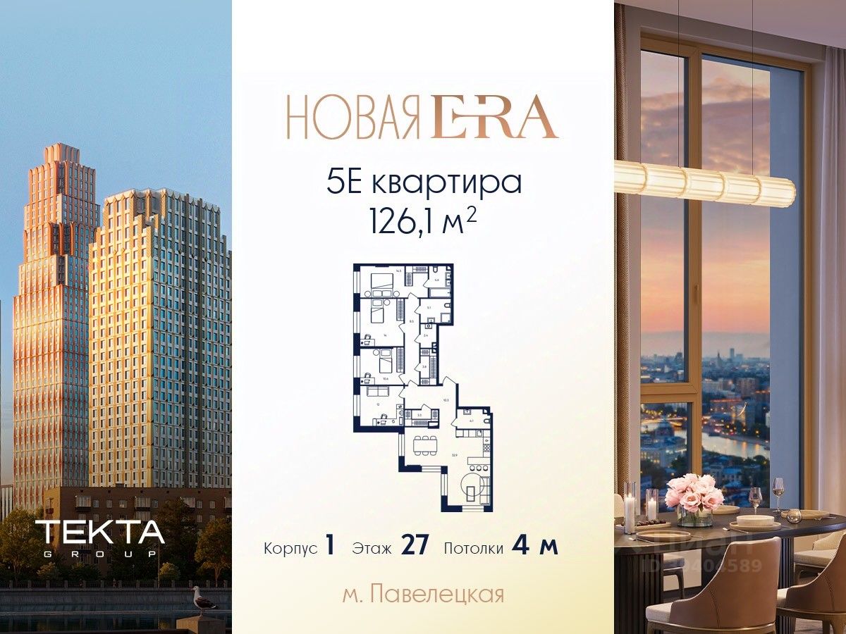 5-комн. квартира в ЖК ''Era'' на 27 этаже в 27 этажном здании Корпус 1. Общая площадь: 126.1 кв.м., жилая: 75.80 кв.м. Высота потолков 4.00 м.