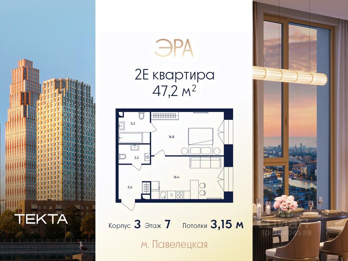 2-комн. квартира в ЖК ''ЭРА'' на 7 этаже в 33 этажном здании Корпус 3. Общая площадь: 47.2 кв.м., жилая: 27.90 кв.м. Высота потолков 3.15 м.
