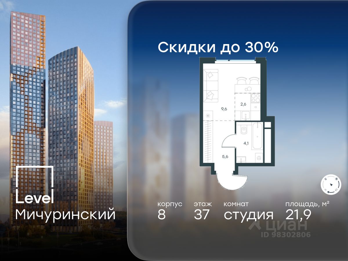 В жилом квартале, расположенном на границе с природным заказником ''Долина реки Очаковки'', продаётся студия площадью 21.90 кв.м без отделки. Квартира расположена на 37 этаже 48-этажного корпуса 8 в жилом комплексе бизнес-класса Level Мичуринский (компания Level Group/Левел групп).