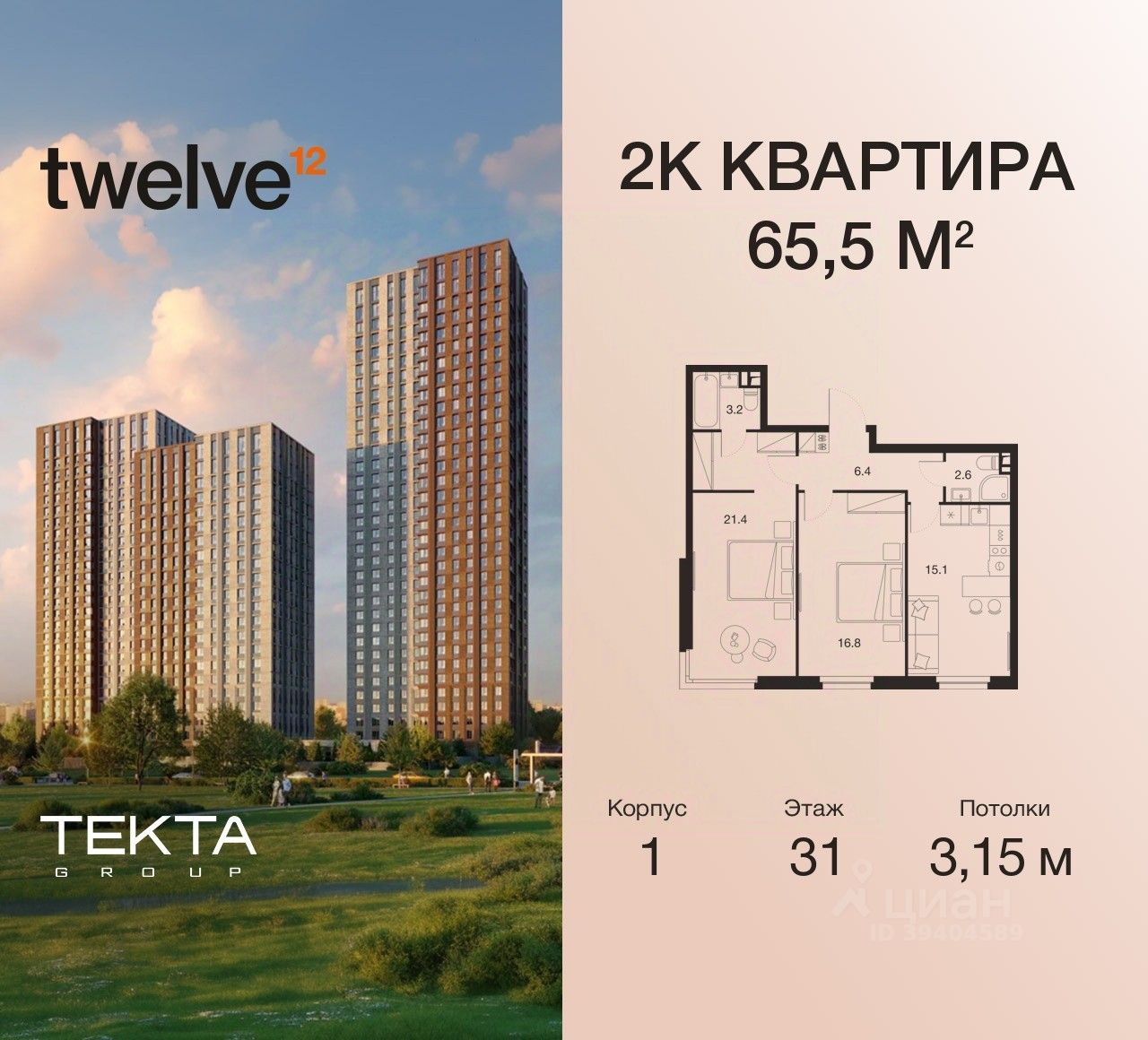 2-комн. квартира в ЖК ''Twelve'' на 31 этаже в 34 этажном здании Корпус 1. Общая площадь: 65.5 кв.м., жилая: 38.20 кв.м. Высота потолков 3.15 м.