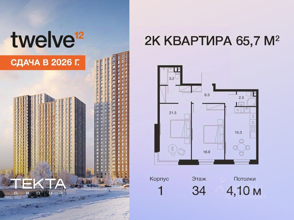 2-комн. квартира в ЖК ''Twelve'' на 34 этаже в 34 этажном здании Корпус 1. Общая площадь: 65.7 кв.м., жилая: 38.40 кв.м. Высота потолков 4.10 м.