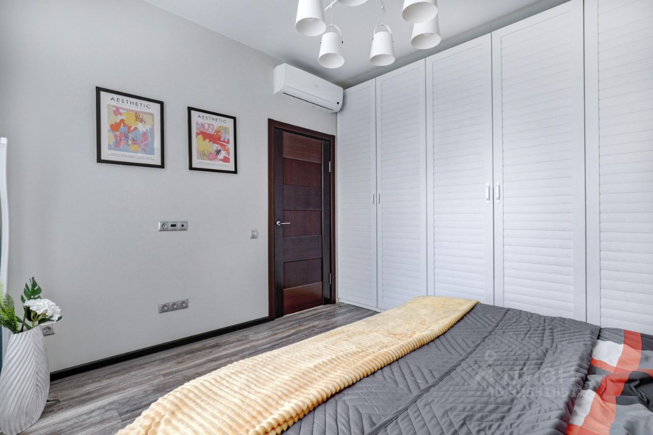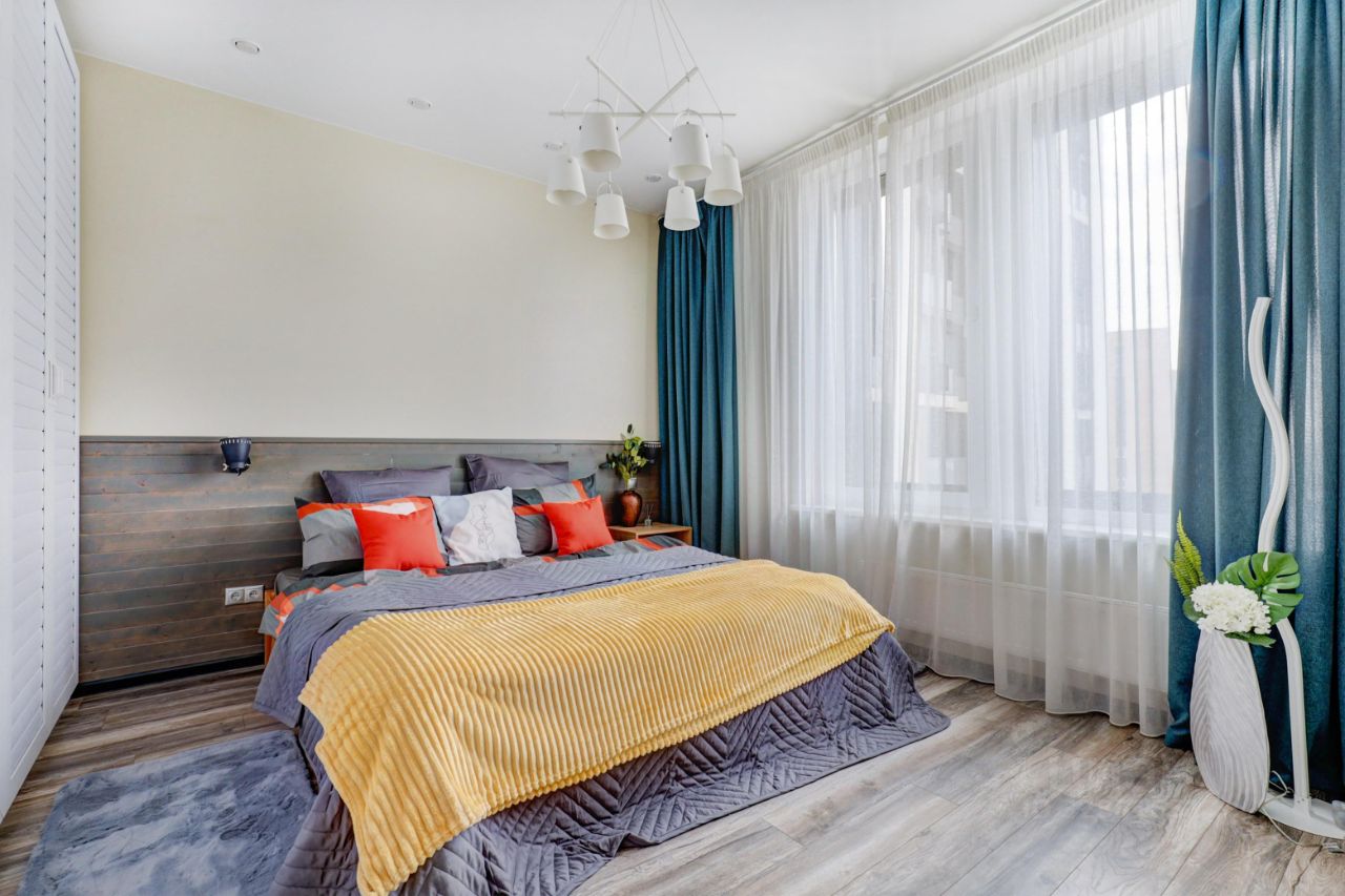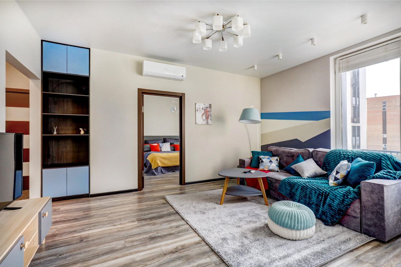 Просторный апартамент с отдельной спальней и гардеробной. Много места для хранения, большая ванная комната, в зоне гостиной много места для рабочего стола при необходимости. Красивый вид из окна в сторону центра (особенно вечером когда включается подсветка зданий). В спальне большая двуспальная кровать на 180. Окна выходят на южную сторону, в апартаменте очень светло.