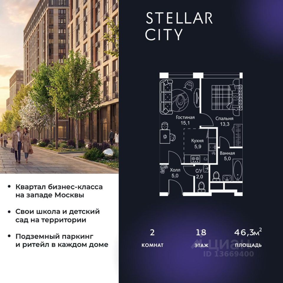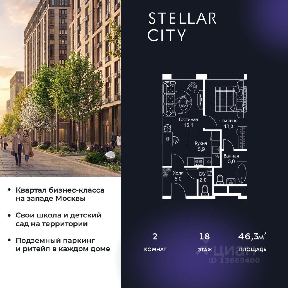 Продается квартира от надежного застройщика Tashir Estate в квартале бизнес-класса Stellar City в ЗАО Москвы.