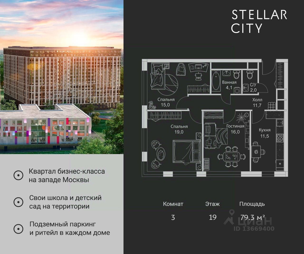 Квартира находится на 19 этаже, 4 корпуса жилого квартала Stellar City — микрогорода будущего на орбите Москвы.