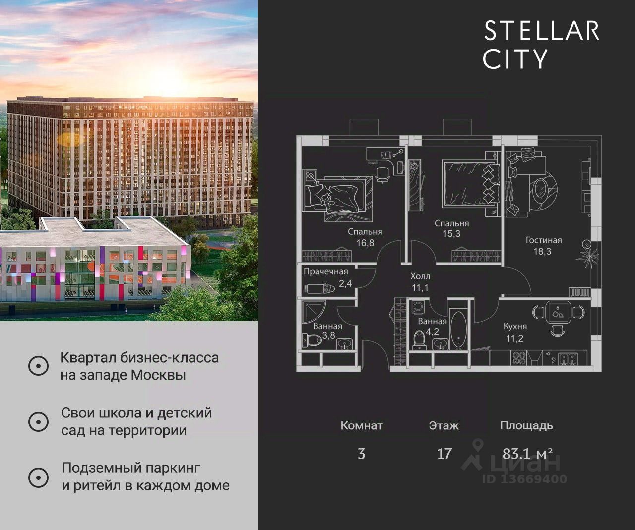 Продается квартира от надежного застройщика Tashir Estate в квартале бизнес-класса Stellar City в ЗАО Москвы.