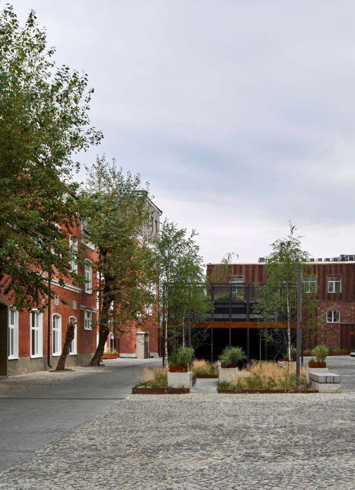 Мы восстановили исторические фрагменты и вписали их в современную концепцию: на территории много стекла, дерева, брусчатка, креативное озеленение. В проекте мы использовали материалы, которые будут органично выглядеть, видоизменяясь со временем: бетон, заржавленную сталь ''кортен'', термодревесину и медные панели.