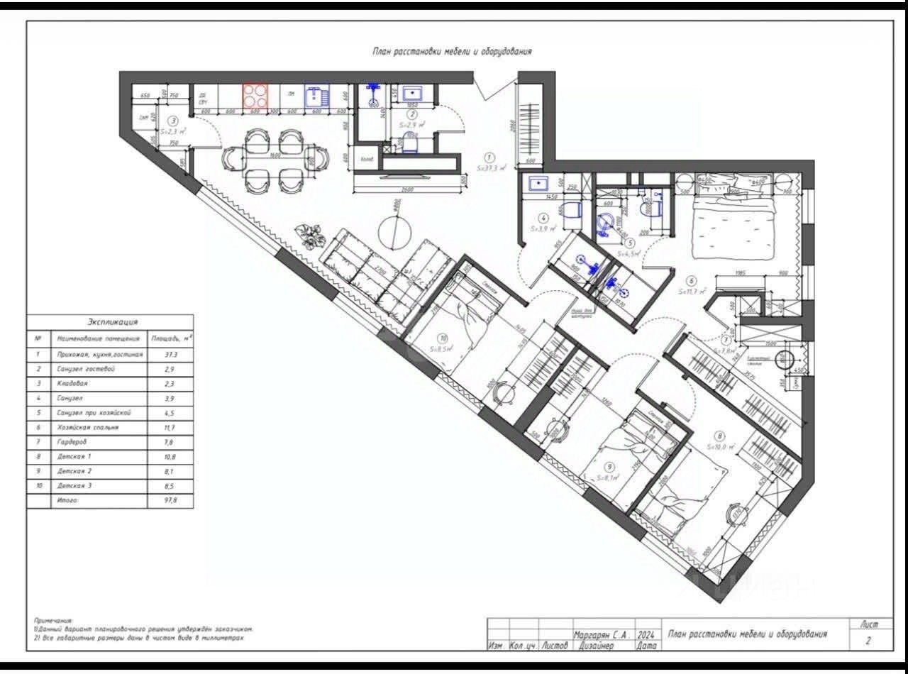 Панорамное остекление в зоне кухни-гостиной открывает впечатляющие виды на Москву и деловой центр ''Москва-Сити''. Планировка функциональна и включает три изолированные спальни, одна из которых — мастер-спальня с собственной гардеробной и санузлом. Всего в квартире три санузла, отдельная гардеробная и кладовая. Отделка выполнена с использованием натуральных материалов: мрамора, гранита и шпона эвкалипта. Объект полностью готов к проживанию: установлена премиальная встроенная техника, система кондиционирования, теплые полы и электроприводы на шторы.