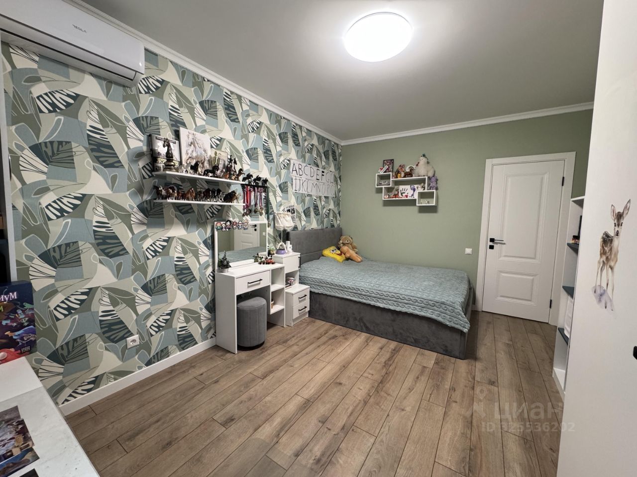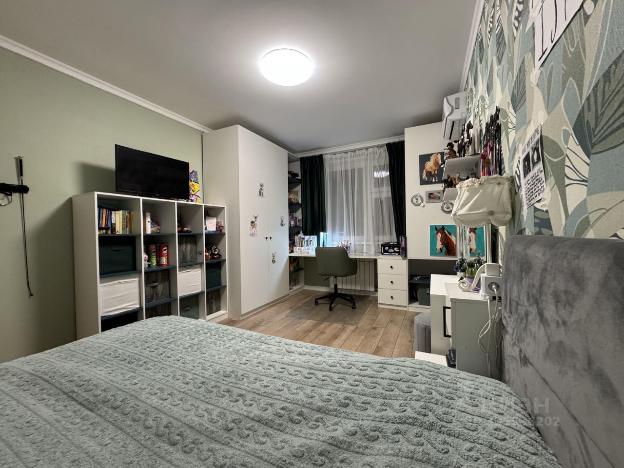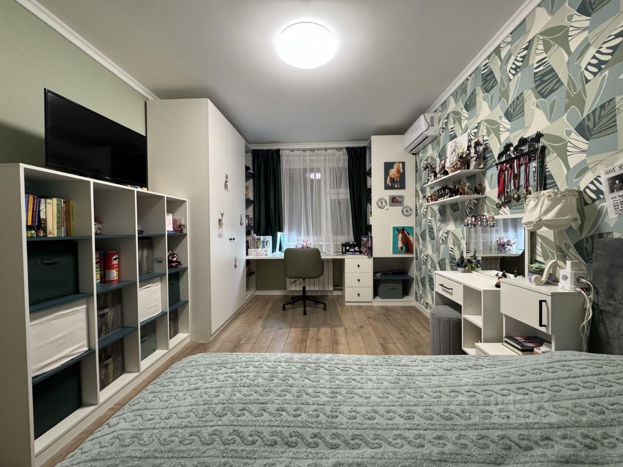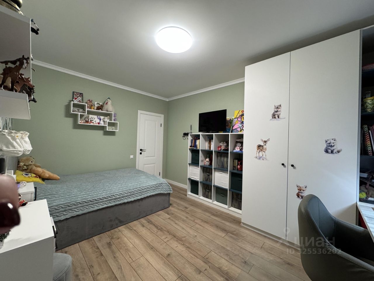 В детской комнате 14,9 м2 много места для хранения за счет продуманной встроенной мебели. Цвета комнаты нейтральные, поэтому подойдут как мальчику, так и девочке.