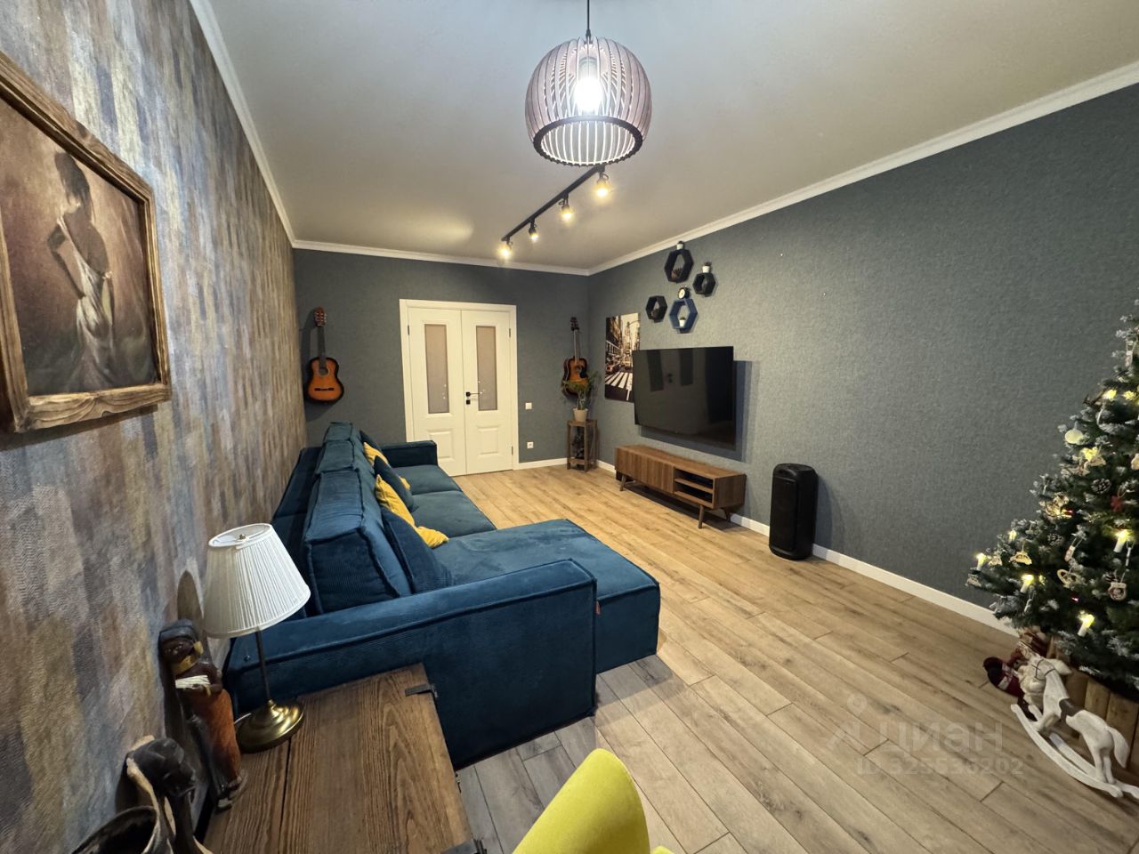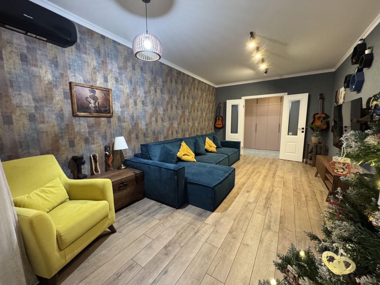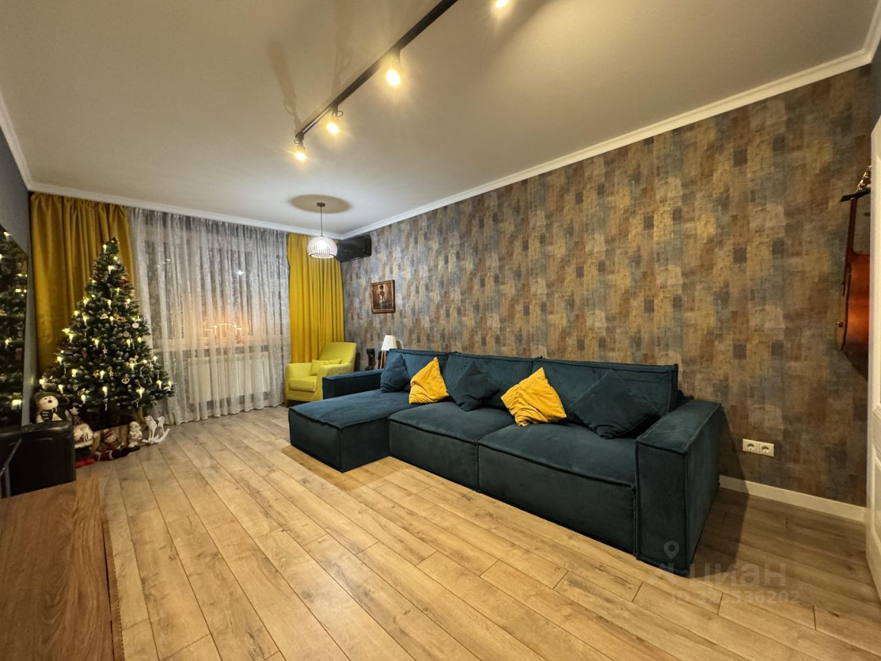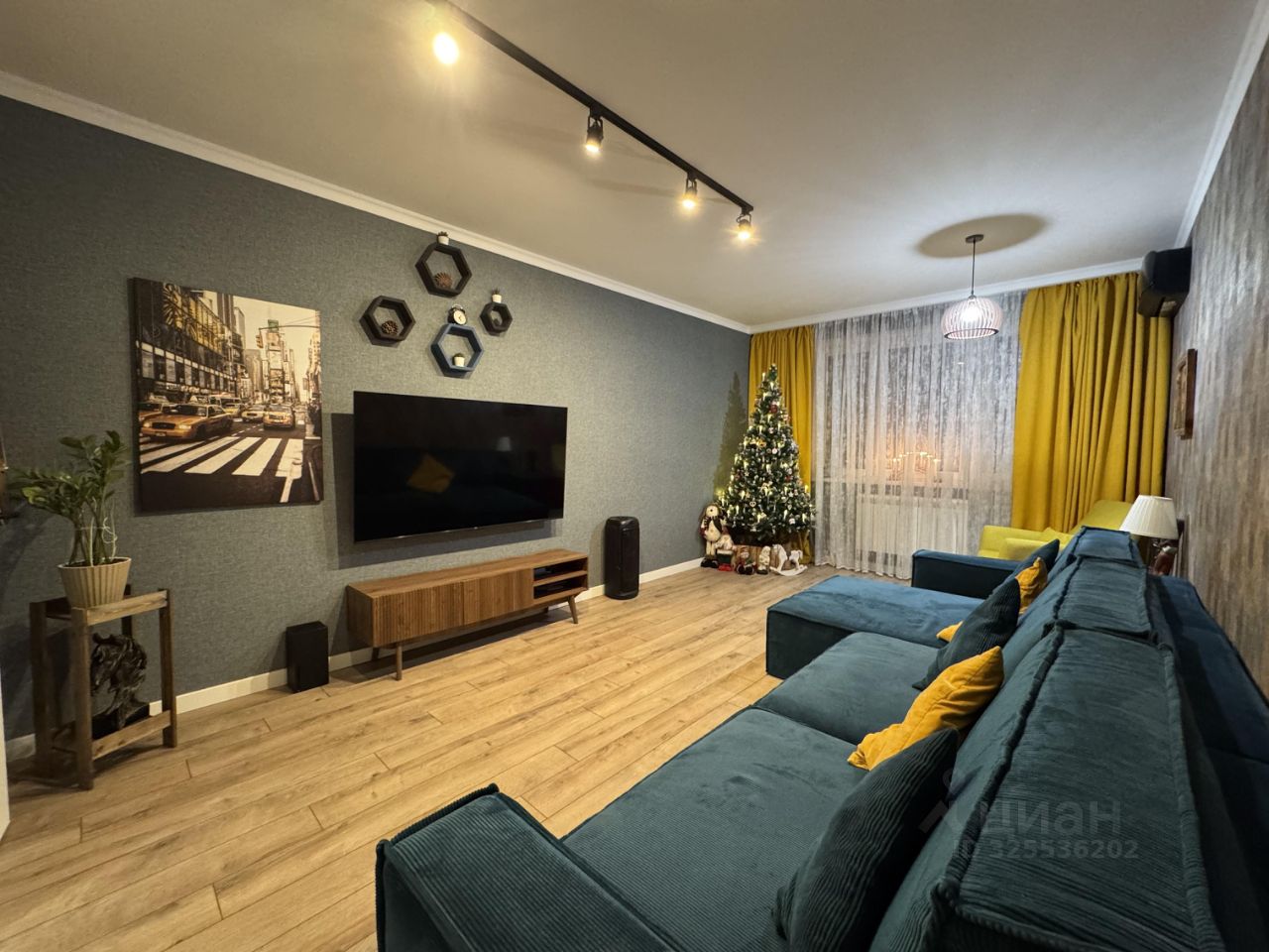 В прекрасной светлой гостиной 19.9 м2 с большим диваном, можно проводить вечера всей семьей за просмотром фильмов.