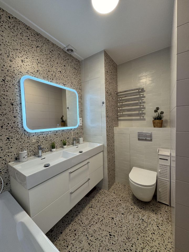 Ремонт от застройщика был полностью переделан дорогими и качественными материалами. Вся квартира в современном стиле и светлых тонах, что придает ей легкость и ощущение уюта.