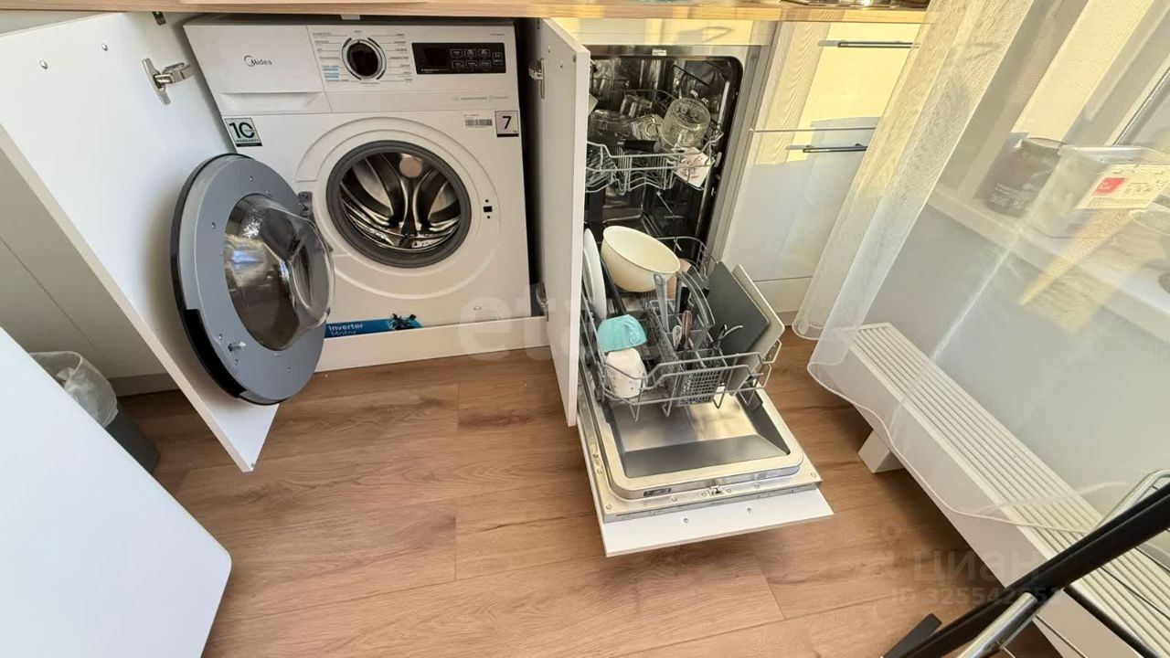 Квартира укомплектована кухонным гарнитуром из Стильных кухней, стиральной и посудомоечной машиной, так же установлено остекление в ванной, есть отдельная гардеробная для хранения вещей