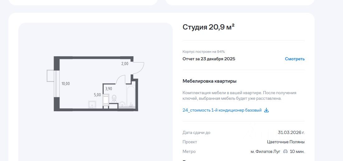 Срочно продам студию 21 м2 с отделкой, кухней + техника (холодильник, духовой шкаф, варочная панель, посудомоечная машина, вытяжка), кондиционер в ЖК Цветочные поляны по переуступке. Сдача корпуса 31.03.2026 г. Прописка Москва. Объявление актуально до 19 января.