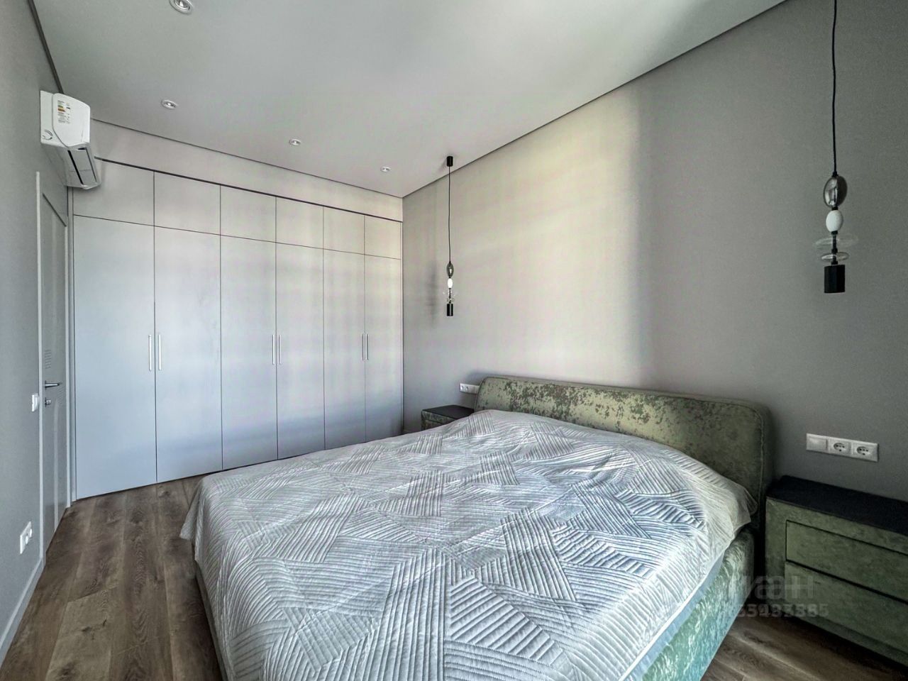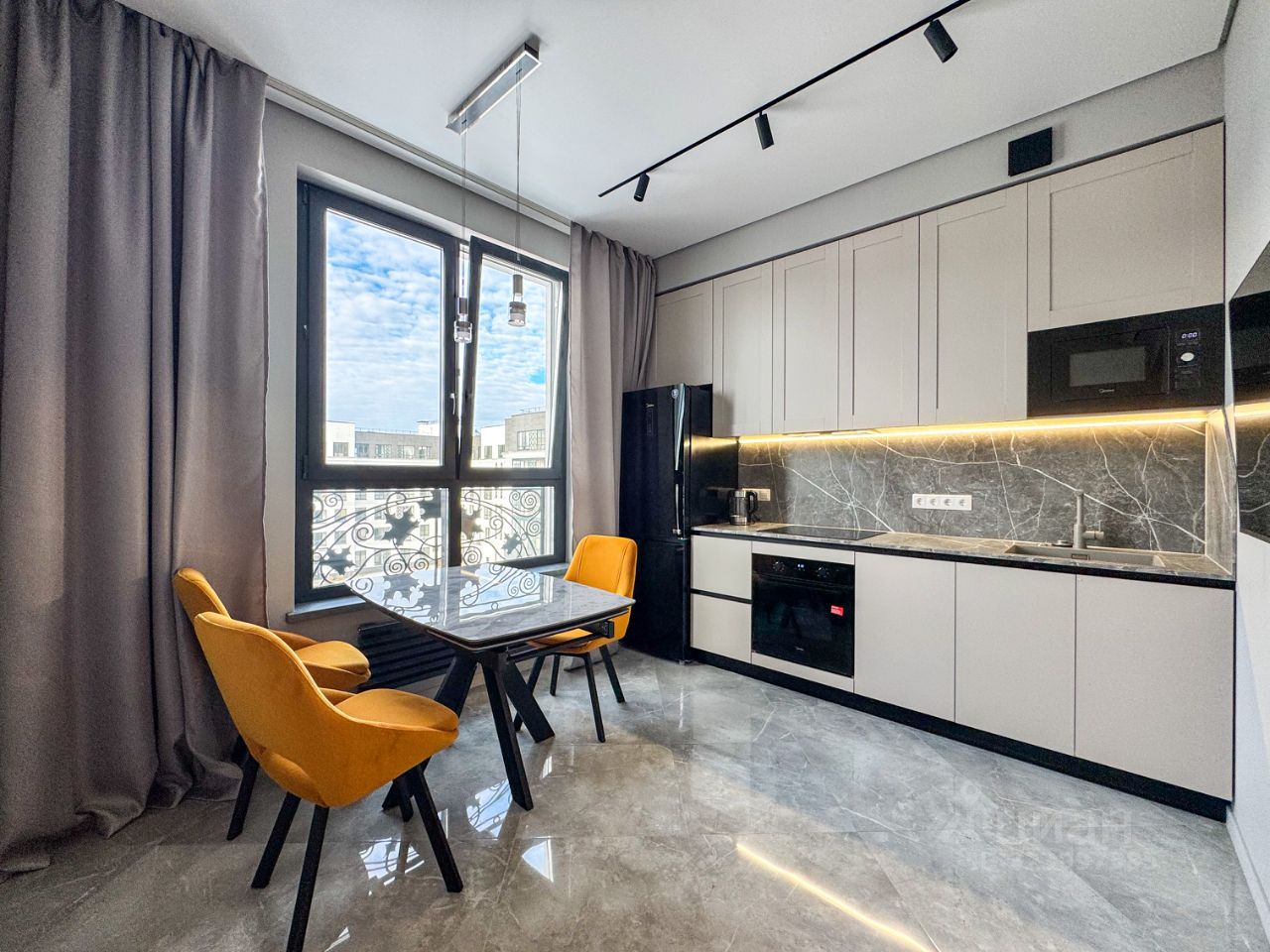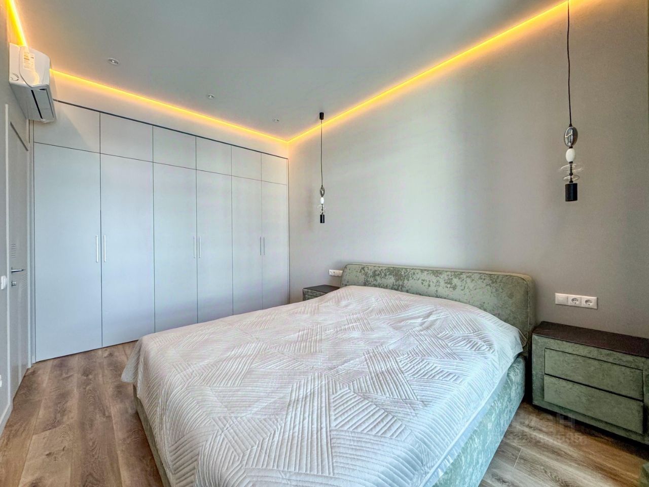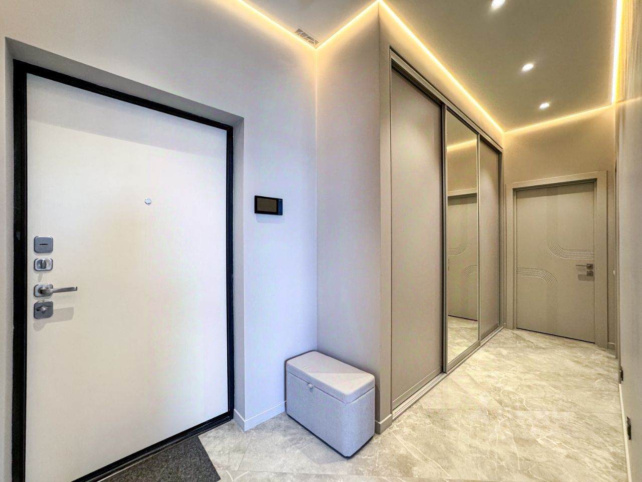 По планировке: -Просторная кухня -Спальня с двуспальной кроватью и ортопедическим матрасом 200х180 -Лоджия с небольшим кладовым помещением (за черной дверью на фото) -Кабинет с раскладывающимся диваном и оборудованным рабочим местом -Большой сан.узел с ванной и отдельностоящей душевой кабиной Кондиционеры в каждой комнате, подогрев пола на кухне, в лоджии,в коридоре и сан.узле. Дополнительно на кузне установлены: фильтр для питьевой воды, измельчитель бытовых отходов в раковине.