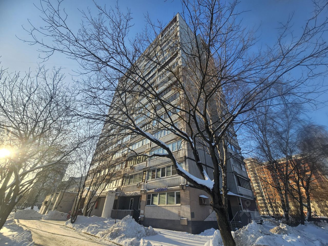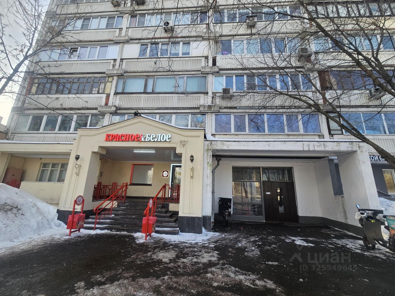 На первом этаже и в пристройке ''Пятерочка'', ''Красное и белое'', аптека, барбершоп.
