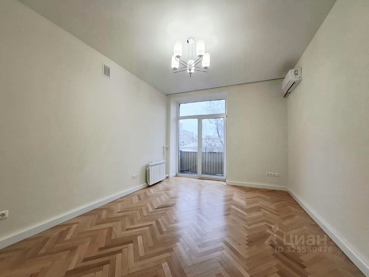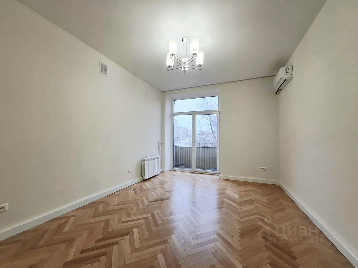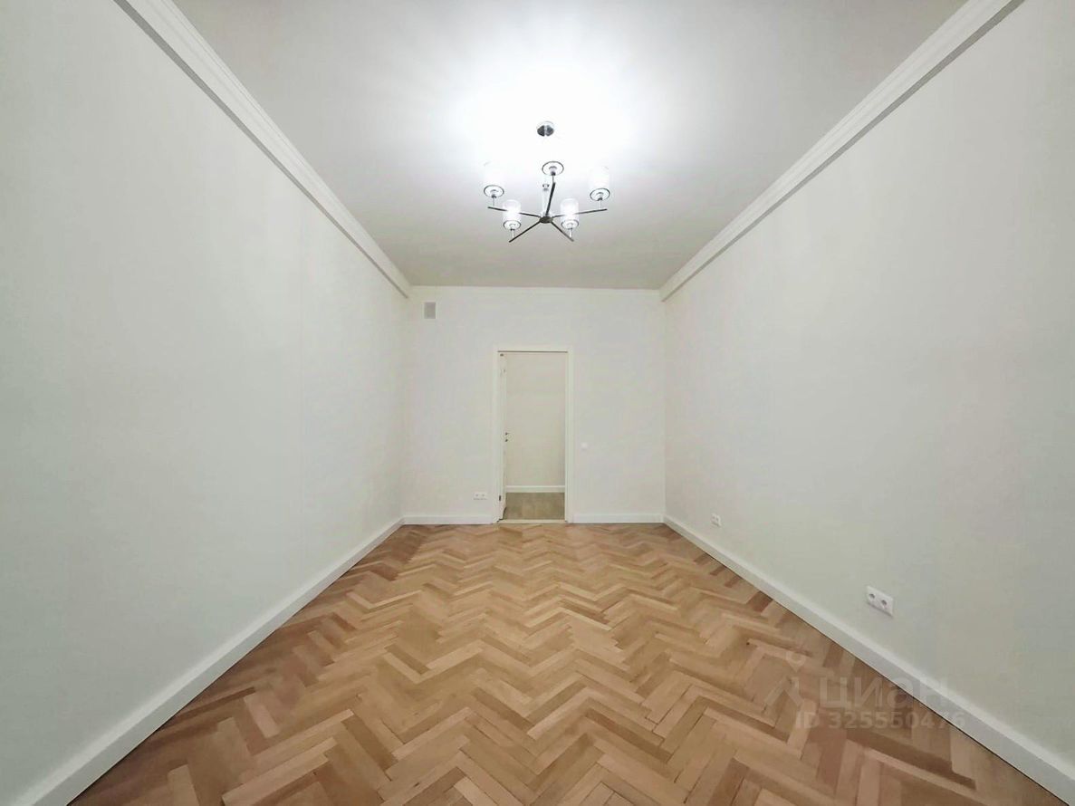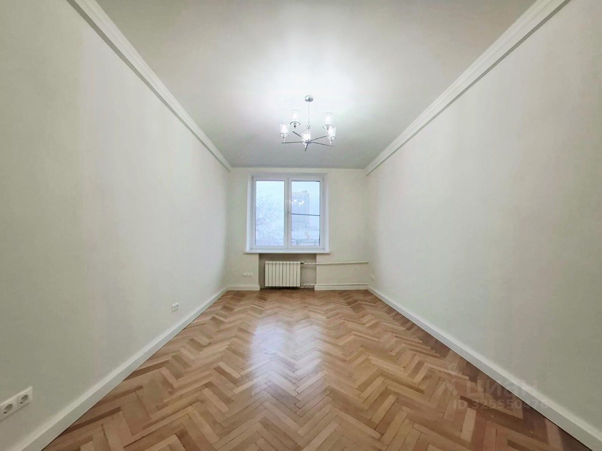 В комнатах мебели нет. Карнизы для штор установлены. Новые обои. Циклеванный паркет. Новые двери.