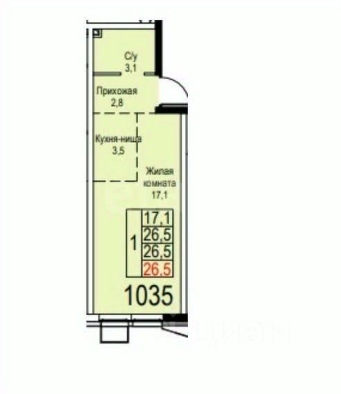 Студия на 4 этаже, 26,7 кв.м.