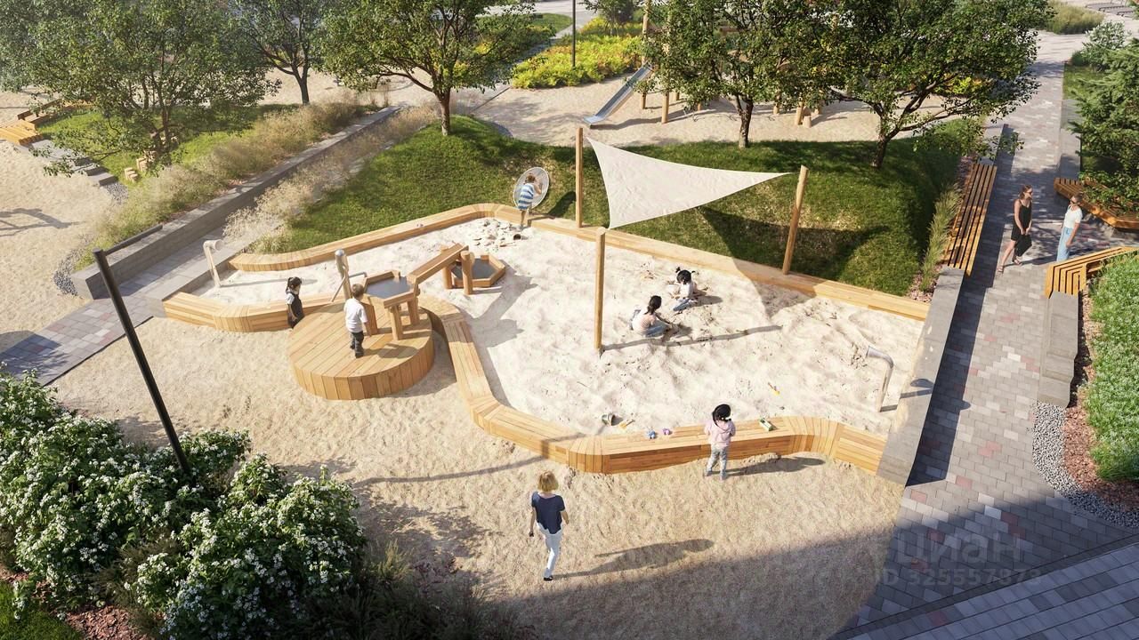 Символические ворота новой очереди Академического — самого молодого и яркого района Екатеринбурга. Лента воды и фасад из красного кирпича напомнят о заводе-крепости, стоявшему ниже по течению реки Патрушихи.