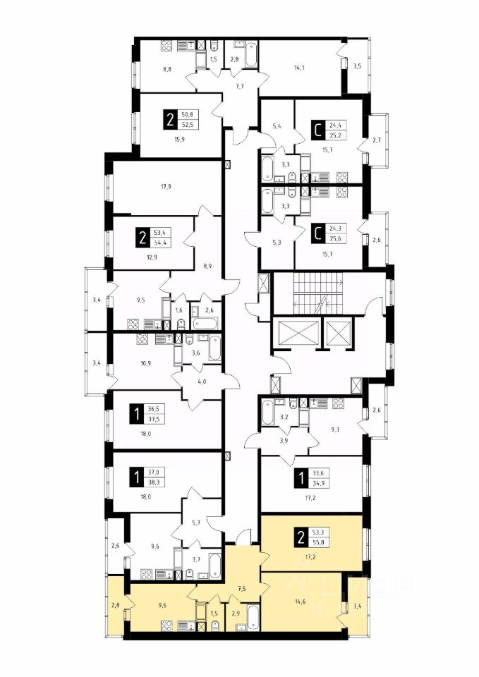 Продаётся 2-комнатная квартира в строящемся доме (Корпус 1), срок сдачи: 1-кв. 2026, общей площадью 55.80 кв.м., на 10 этаже.