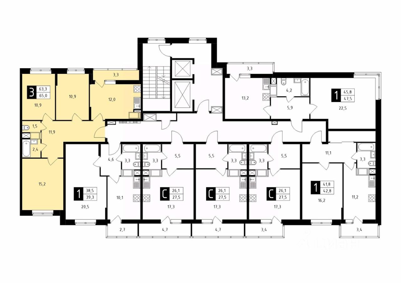 Продаётся 3-комнатная квартира в строящемся доме (Корпус 1), срок сдачи: 1-кв. 2026, общей площадью 65.00 кв.м., на 7 этаже.