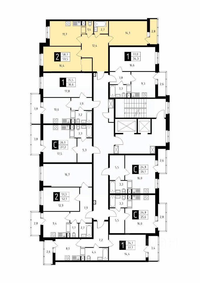 Продаётся 2-комнатная квартира в строящемся доме (Корпус 1), срок сдачи: 1-кв. 2026, общей площадью 59.60 кв.м., на 2 этаже.