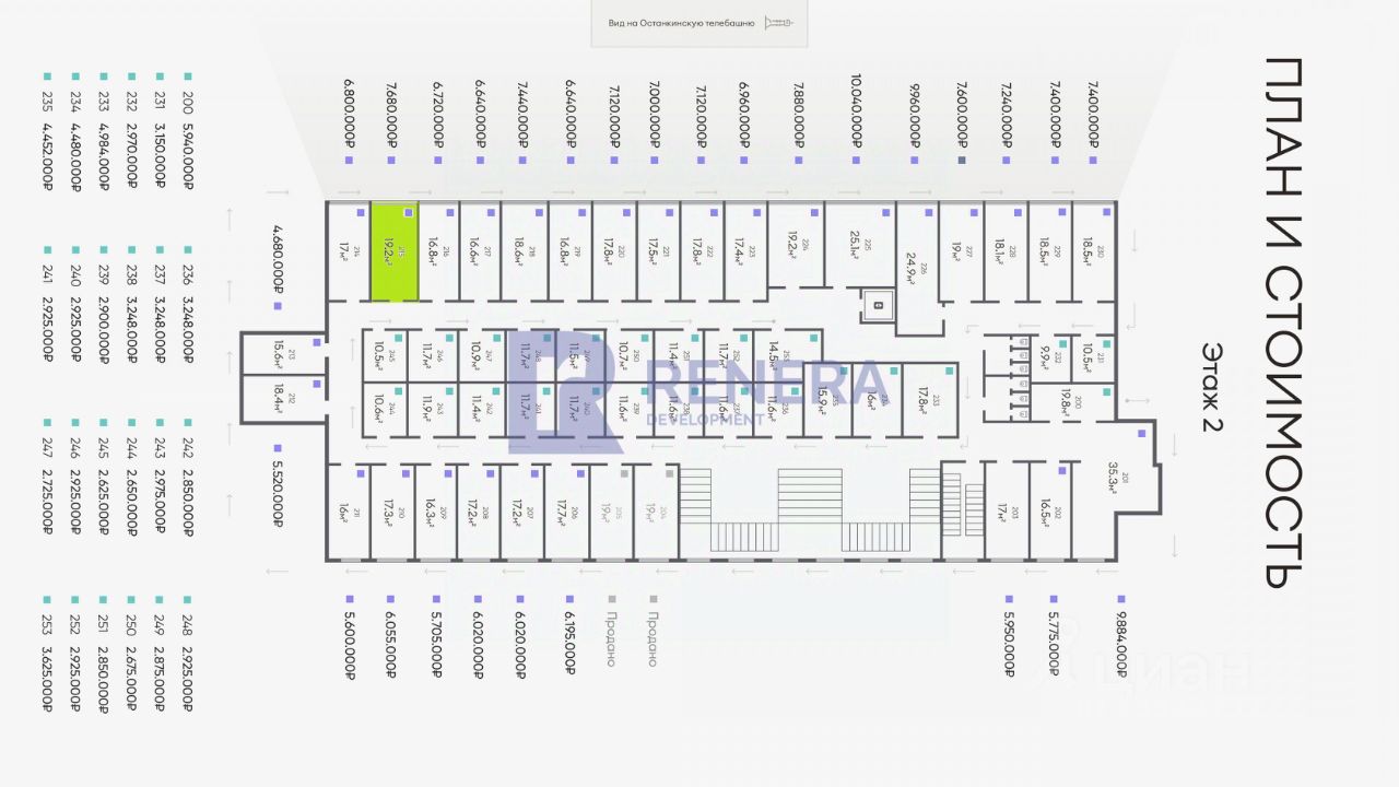 Ключевые цифры: Офис: 215 Этаж: 2 из 3 Вид на Останкинскую башню Площадь: 19,2 м² Цена за м²: 400 000 руб. Полная стоимость: 7 680 000 руб.