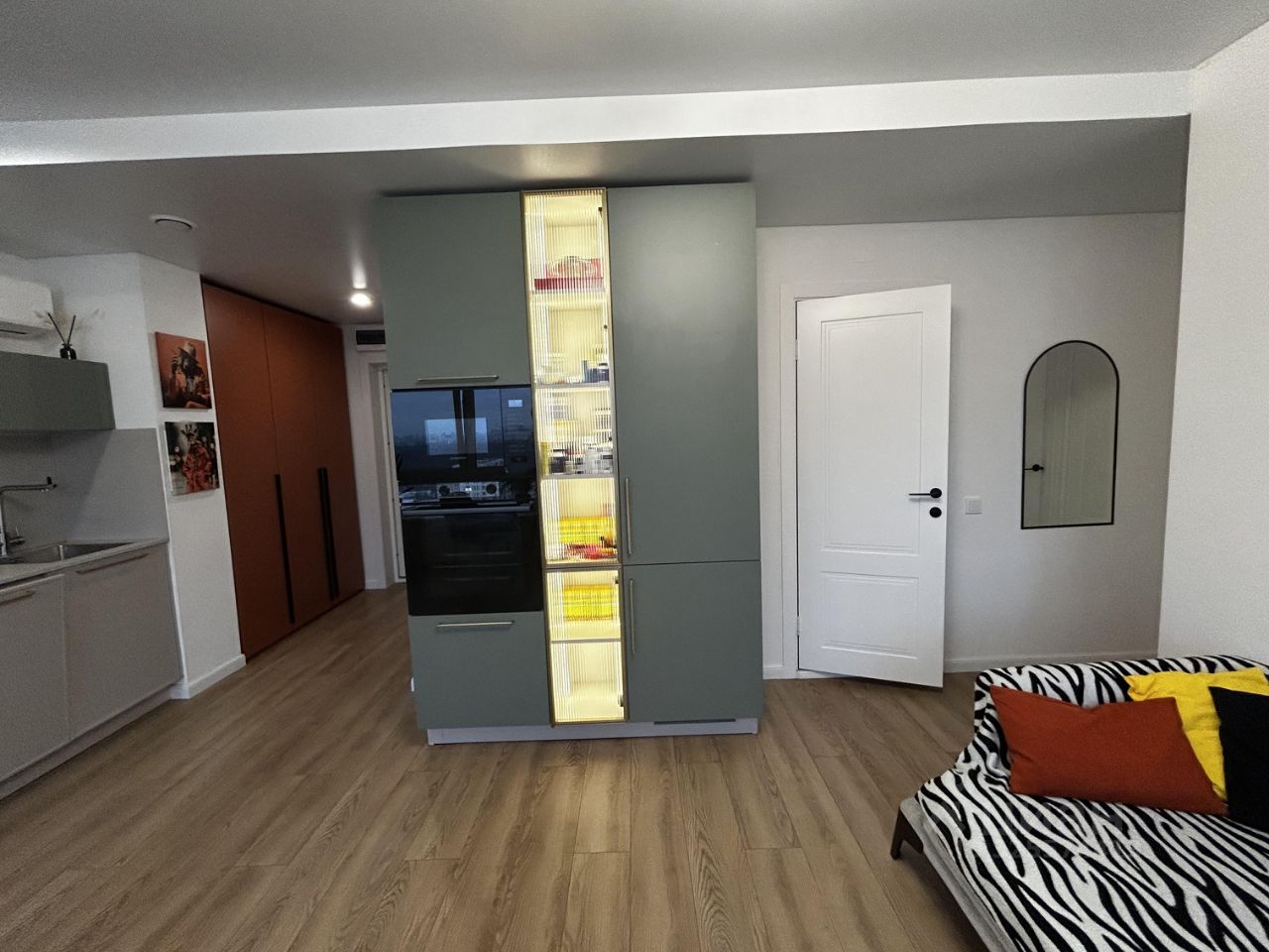 Квартира с качественным ремонтом и доработками. Планировка: 2 спальни, кухня-гостиная, 2 санузла (один используется как кладовка, все коммуникации сохранены). Установлена входная дверь Torex, межкомнатные двери Verda, дюрополимерные плинтусы. На окнах заменены уплотнители и установлены механизмы верхнего открывания. В спальнях выполнены скрытые карнизы (на 3 окнах). Разведена электрика: дополнительные розетки на кухне, под ТВ в гостиной и спальне, под стиральную машину. В электрощиток выведен отдельный узел под проточный водонагреватель для малого санузла. Квартира продаётся с мебелью и техникой: кухонный гарнитур и мебель в ванной от Стильные кухни, шкафы в прихожей и спальне — Divan/ru, встроенные духовой шкаф, посудомоечная машина и микроволновка. Заменён унитаз Am/Pm.