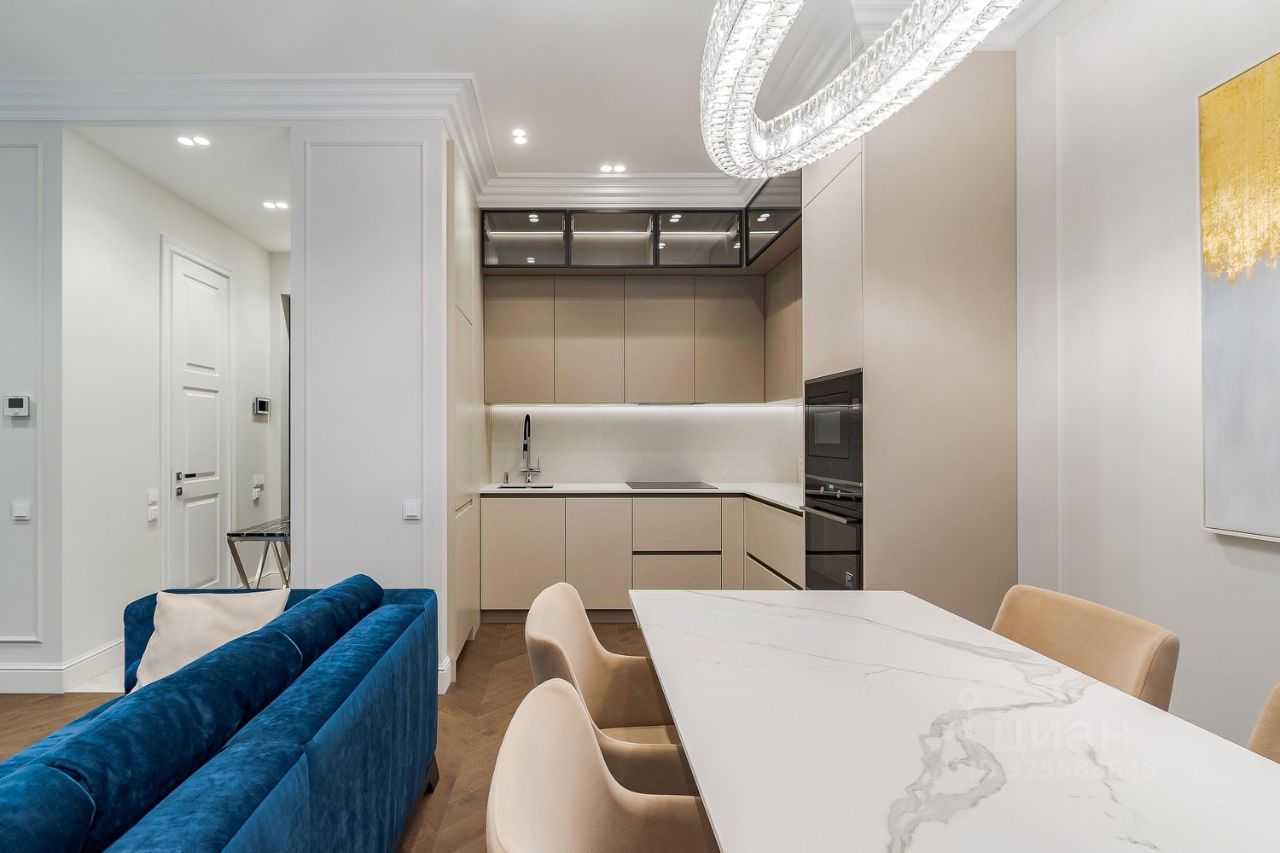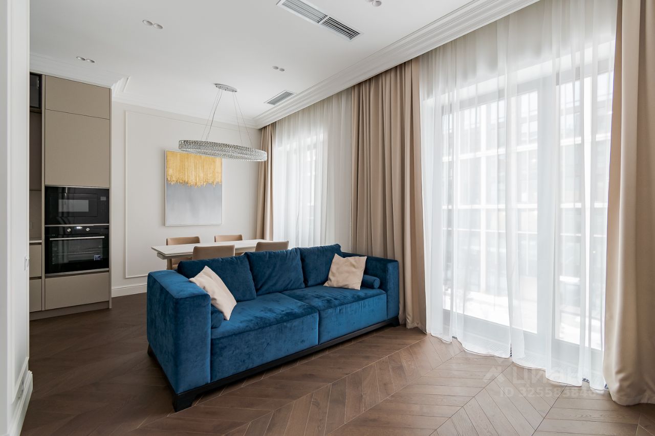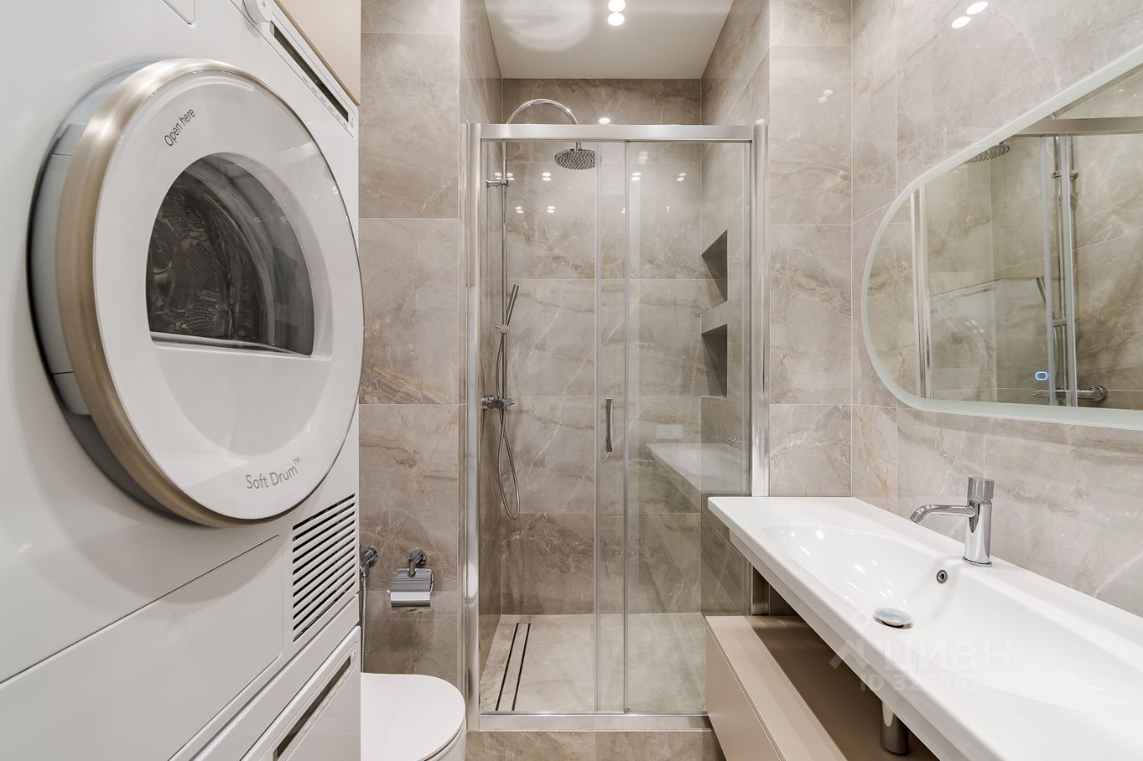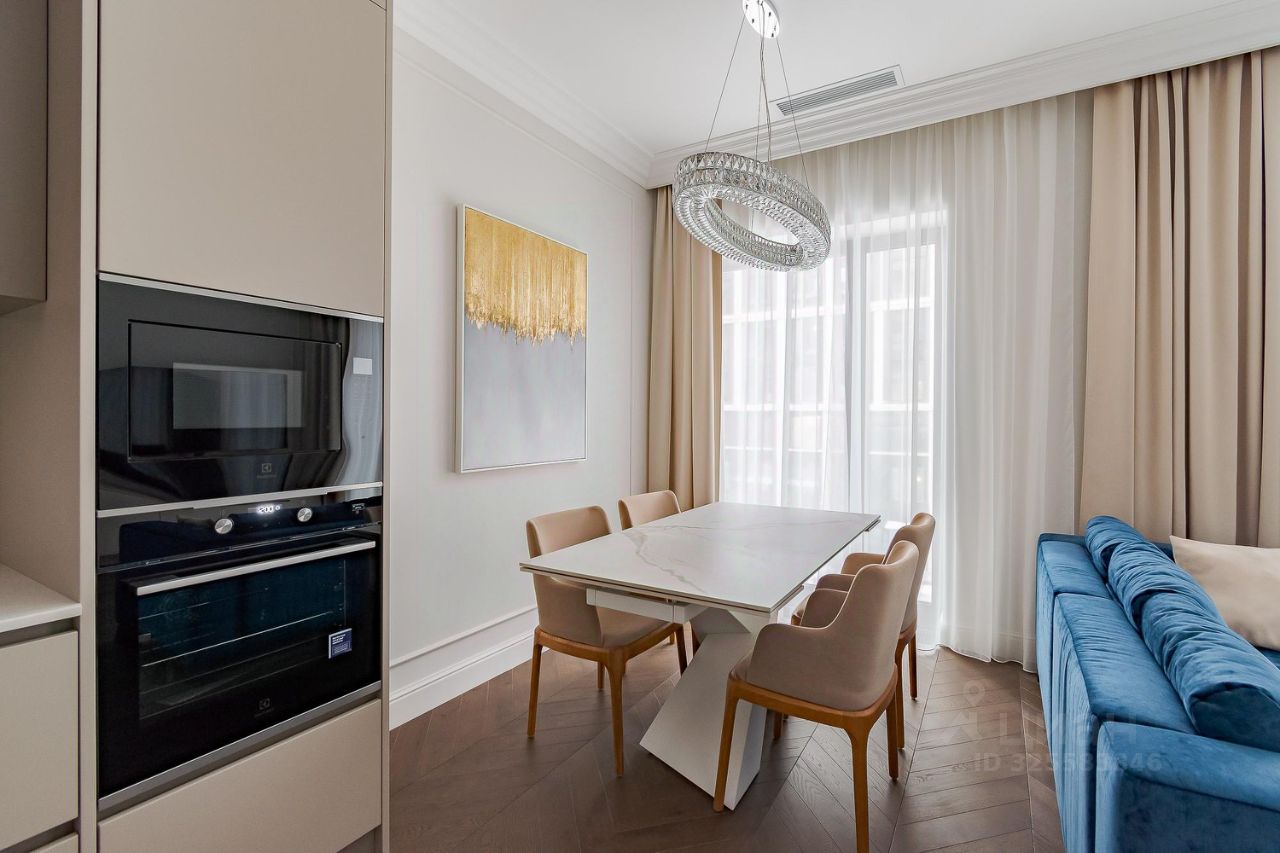 Апартамент грамотно спланирован: отдельная спальня со своей гардеробной комнатой, большая кухня-гостиная с двумя окнами в пол, совмещенный санузел с душевой кабиной и прихожая с теплыми полами. Приточно-вытяжная система кондиционирования, встроенный кухонный гарнитур со всей необходимой техникой: холодильник, посудомойка, духовой шкаф и СВЧ печь, индукционная варочная панель. В санузле стиральная и сушильная машина шведского производителя премиум-класса Asko, качественная сантехника из магазина Maxlevel, в гостиной большой телевизор LG Qned 65 дюймов. Вся мебель сделана на заказ у ведущих производителей, массивные двери высотой 2.5м, на полу инженерная доска Finex (раскладка французская елка).