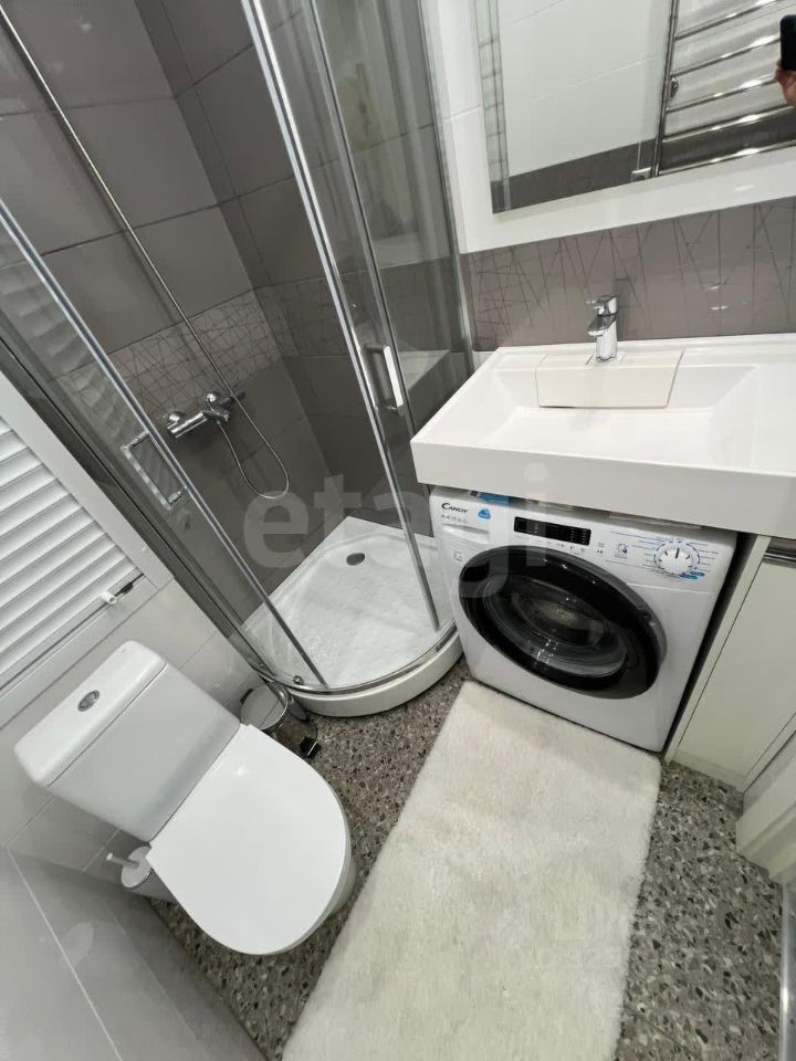 В кухне имеется встроенная бытовая техника: двухкамерный холодильник, двух комфорочная электрическая панель, вытяжка, система фильтрации воды, посудомоечная машина, микроволновая печь, телевизор и интернет. В прихожей имеется большой трехстворчатый шкаф с зеркалом. Кухня и шкаф представляют единую стильную конструкцию, у которой предусмотрено очень много мест для хранения. Санузел совмещённый с просторной душевой кабиной, бойлером для нагрева горячей воды, электрическим поворотным полотенцесушителем, стиральной машиной.