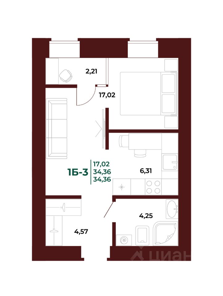 Общая площадь34,34 м2