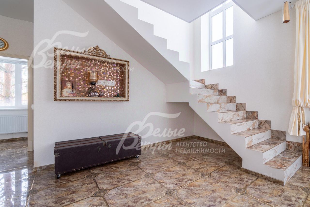Описание внутренней отделки: в доме выполнен ремонт ''под ключ'' с использованием материалов ведущих производителей, в том числе испанской плитки NAVARTI. Стены оформлены флизелиновыми обоями EURO DCOR. В санузлах уложена коллекционная плитка в классическом стиле (производство Испания и Италия), дополнительно оборудована система подогрева. Напольное покрытие — ламинат CORKSTYL швейцарского производства, в санузлах — коллекционная плитка с подогревом. Потолки натяжные. На застеклённой террасе подготовлены выводы под конвектор и тёплый пол. Установлены шпонированные двери белорусского производства и подоконники с мозаичной отделкой. На второй этаж ведёт бетонная лестница, облицованная плиткой.
