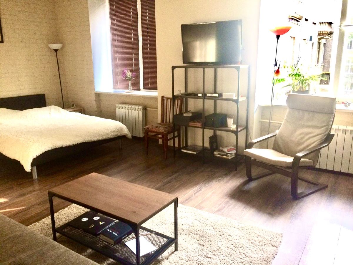Сдаётся студия/квартира из двушки на длительный срок. Квартира очень позитивная, тёплая и тихая. Вьlсокий второй этаж, высокие потолки, дом сталинский кирпичный. Из двушки сделана студия с зонированием. В гостиной раздвижной диван (новый), двуспальная кровать (новая) в спальной зоне с отдельной гардеробной комнатой. Окна выходят в тихий двор. На окнах спальни рольставни, на всех окнах жалюзи. Вся бытовая техника в полном объёме, интернет, водонагреватель, на случай отключения горячей водьl,посудомойка, две металические входные двери. В санузле ванная, душевая кабина, гигиенический душ. Есть отдельная зона кабинета. Рядом магазины, аптека, спортивный клуб, смотровая площадка в пешей доступности. Соседи тихие и интеллигентные.